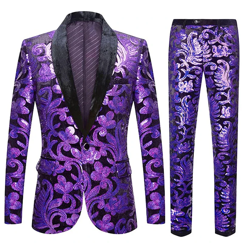 Veste Costume Pantalon Fleurs Brodées Paillettes Homme
