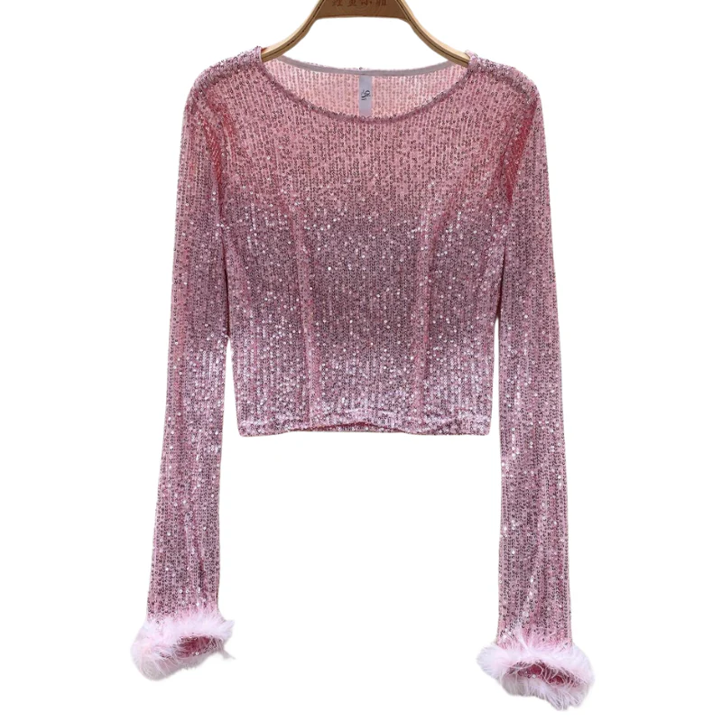 Top Paillette Manches Longues Plumes