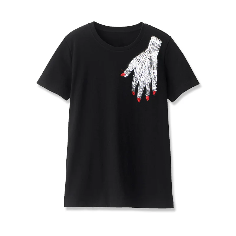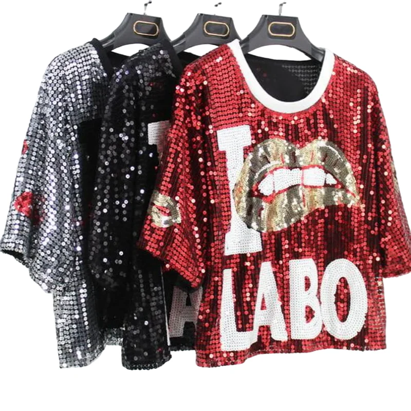 T-Shirt Paillette Col Rond Manches Courtes Femme