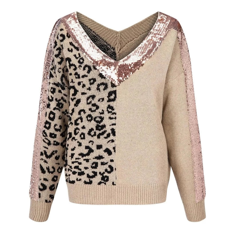 Pull Paillette Col V Demi Leopard