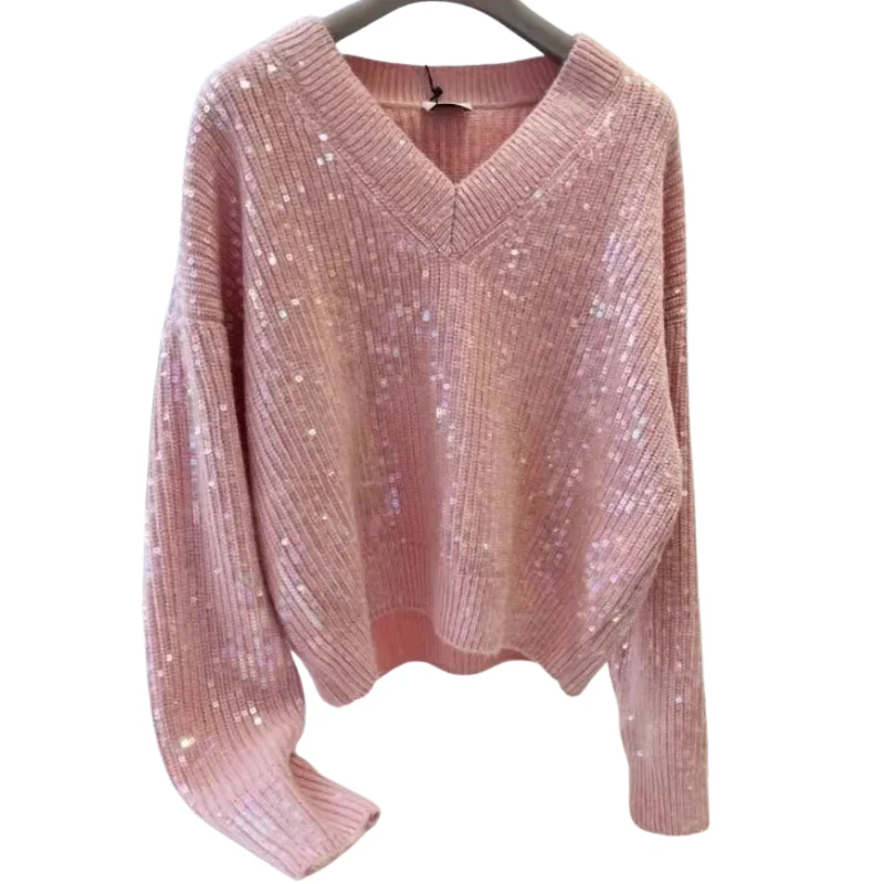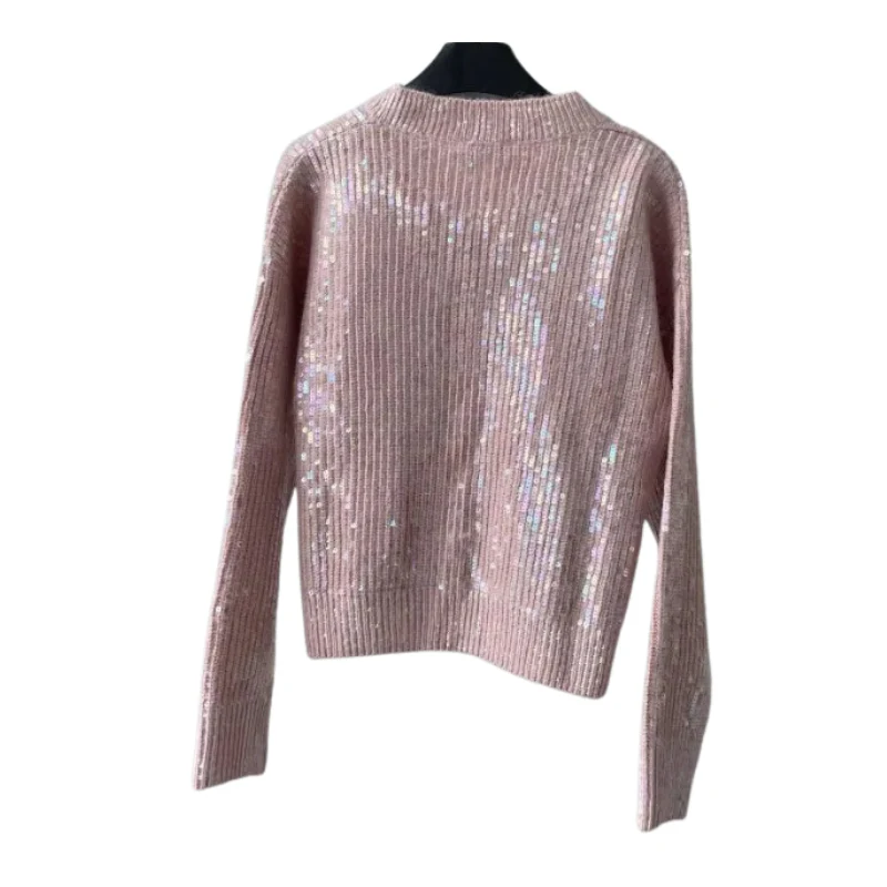 Pull Paillette Col V Rose