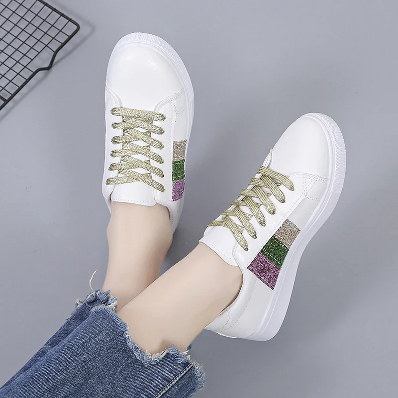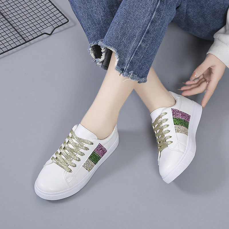 Ces Basket Paillette 3 Bandes sont la définition même de l’éclat dans le monde des chaussures pour femmes. Ces baskets scintillantes séduisent par leur revêtement en similicuir et en paillettes, ajoutant une touche de glamour à chacun de vos pas. La silhouette classique et la couleur neutre de la base permettent d’adapter ces chaussures à un large éventail de styles, tandis que l’épaisse semelle blanche offre un confort durable tout au long de la journée. Des lacets dorés complètent le design, garantissant que ces baskets sont aussi fonctionnelles qu’attrayantes. Idéales pour celles qui souhaitent ajouter un élément audacieux à leur garde-robe, elles s’intègrent parfaitement à un look décontracté ou peuvent être un complément lumineux à une tenue plus sobre. Portez-les pour égayer votre journée ou votre soirée, quelle que soit l’occasion.