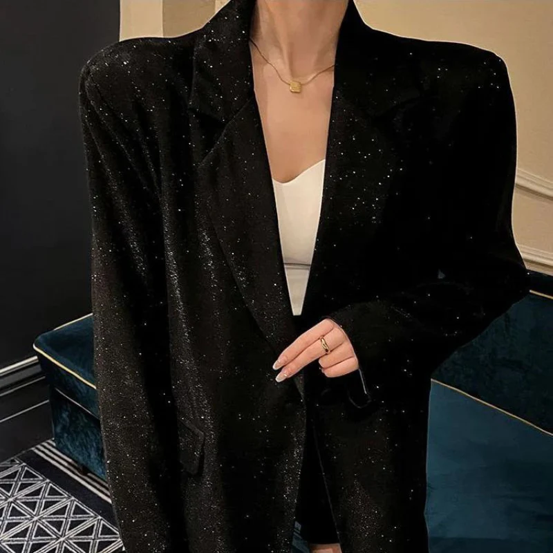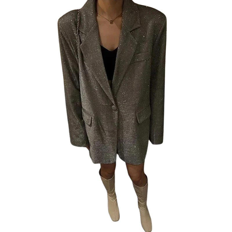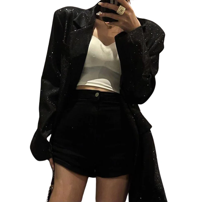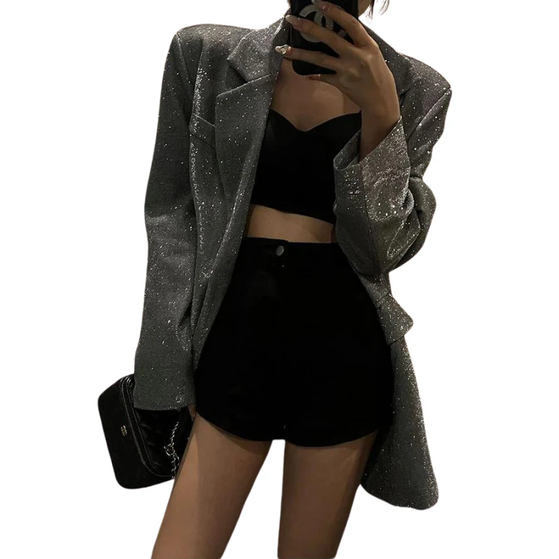 Vous allez adorer la nouvelle tendance de ce blazer à paillettes : c’est le retour de la veste boy-friend dans une direction très girly, qui apportera une touche éblouissante à votre tenue. Vous aimerez jouer avec les tendances grâce à sa coupe large, en créant votre propre style chic ou streewear, suivant vos envies. A porter sur un short ou une jupe pour un look sexy et glamour !