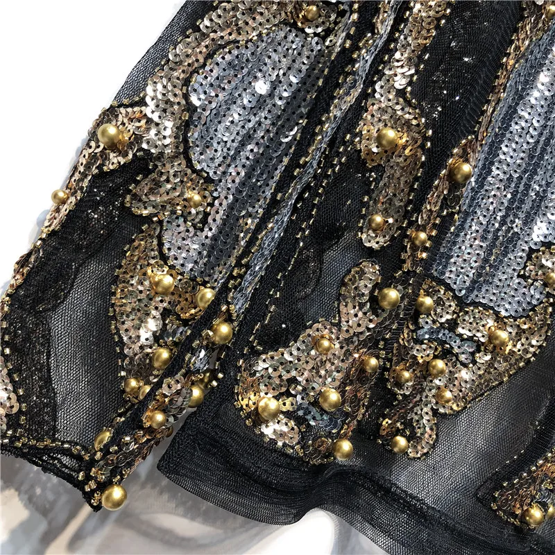 Notre blouse à manches longues transparente à paillettes, vous permettra d’affirmer votre féminité. Elle est conçue dans une matière légère et transparente, vous la porterez avec un top à bretelles ou juste avec un joli soutien-gorge bustier pour un résultat ultra sexy. .