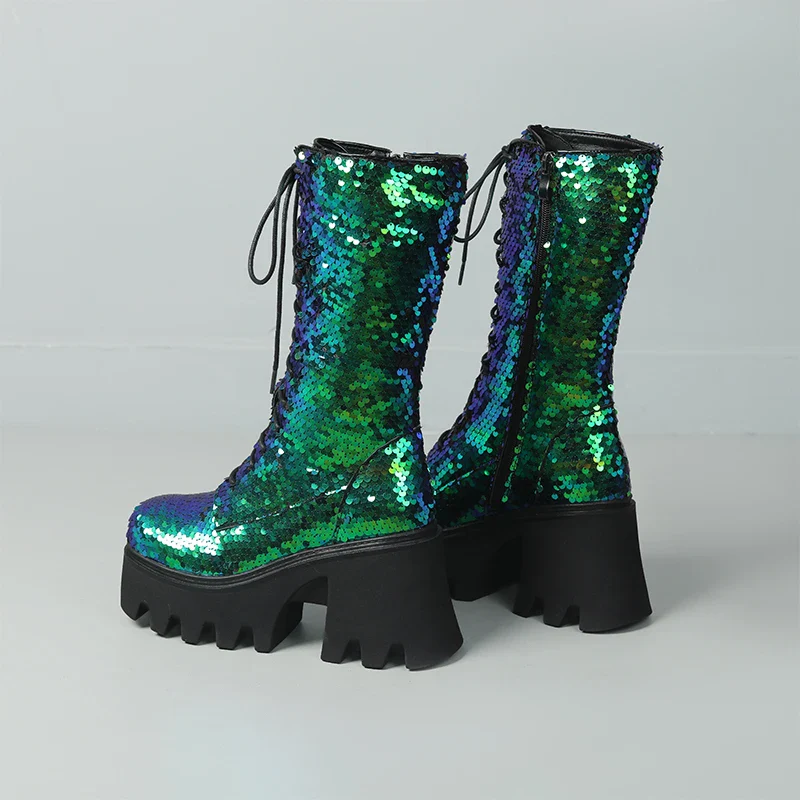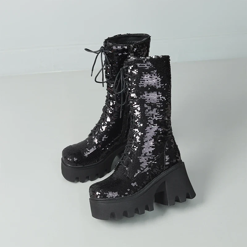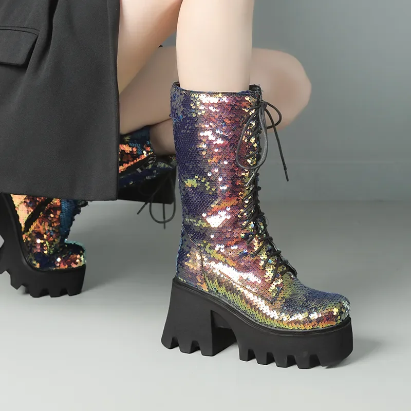 Ces bottes à semelle pailletée seront parfaites pour tous ceux qui aiment le style punk et aventureux. Parfaites pour arpenter les rues et les sentiers, elles sont résistantes et durables, avec des semelles épaisses qui résistent à l’épreuve du temps. Vous aimerez leur look pétillant et leur configuration haute, qui vous tiendra chaud en hiver grâce à leur doublure en polaire. Fabriqué à la main, leur tissu recouvert de paillettes donnera du punch et de l’éclat à votre style.