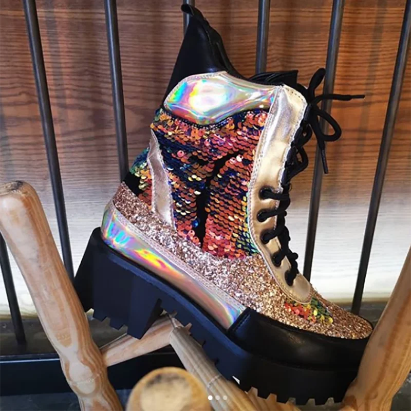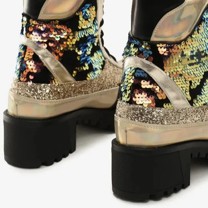 Nos bottines à paillettes dorées sont très girly et rock, elles sont idéales pour donner du caractère à n’importe quelle tenue de saison. Avec un jean ou une robe sur collants, ces chaussures avec ses semelles crantées sont faciles à porter en plus d’être confortables.