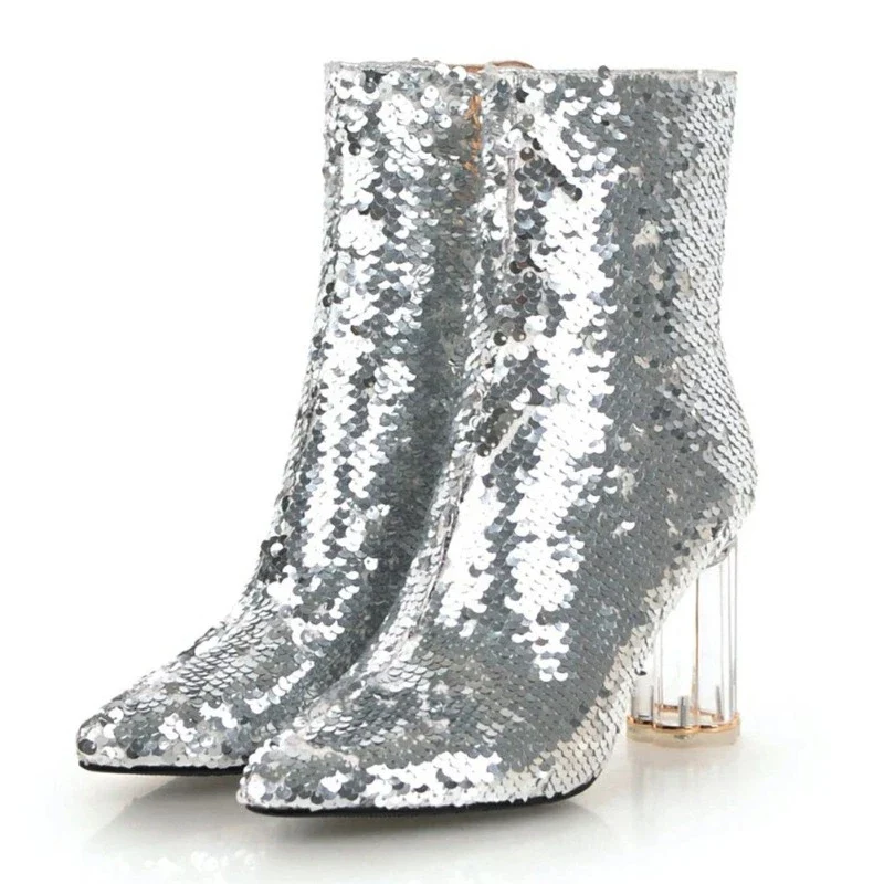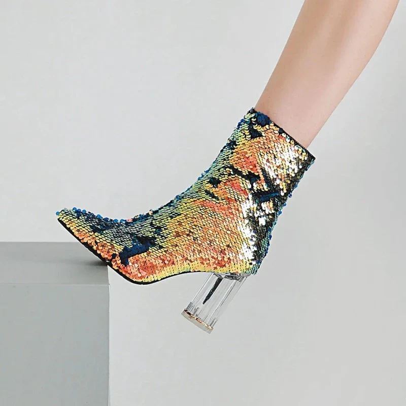 Ces bottines paillettes talon transparent qui n’a pas fini de vous surprendre. On aime les paillettes qui réagissent avec la lumière, les différents tons qui s’illuminent au fil des heures. Associer avec vos tenues de fêtes ou de spectacle, ces bottines d’un confort inégalable seront parfaites. C’est l’alliance parfaite pour tenir toute la journée et la soirée..