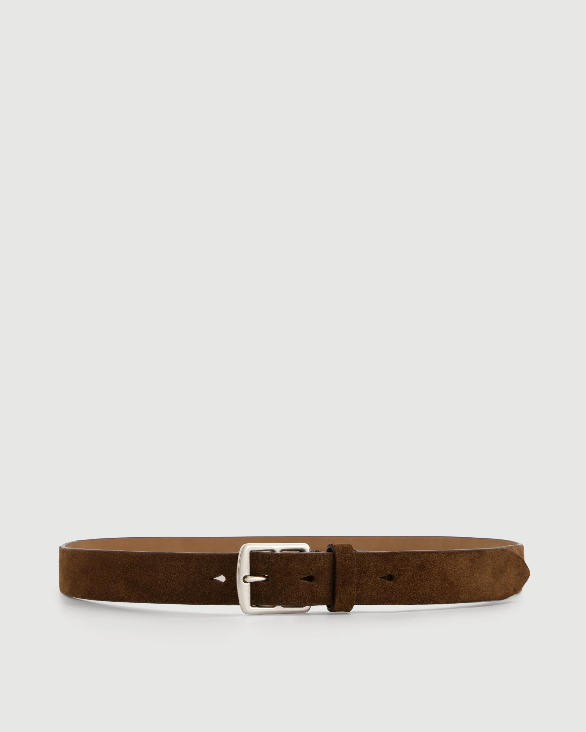 Ceinture homme en cuir suédé marron avec boucle carrée en métal argenté.