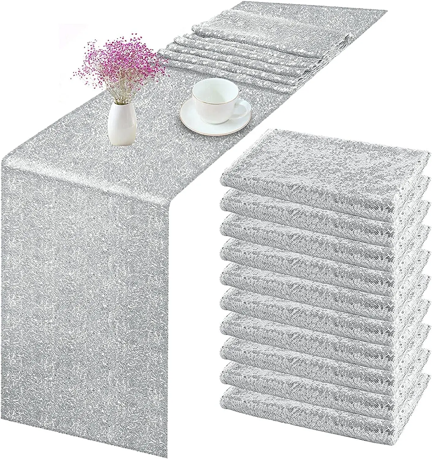 Vous pouvez utiliser nos chemins de table à paillettes pour décorer vos tables lors de mariages, de fêtes, de réceptions, de banquets, d’anniversaires, de Noël, etc. Ils sont fabriqués à partir d’un tissu à paillettes de haute qualité, composé de paillettes rondes de 3 mm de haute densité et d’un support en maille. Les paillettes rondes de 3 mm de haute densité sont cousues fermement sur le tissu à mailles afin de garantir que les paillettes ne se détachent pas facilement. Ils sont faciles à nettoyer, vous pouvez les laver à la main à l’eau froide ou les essuyer délicatement avec du papier humide, puis les suspendre pour les faire sécher. Les chemins de table à paillettes sont durables et peuvent être utilisés à plusieurs reprises.