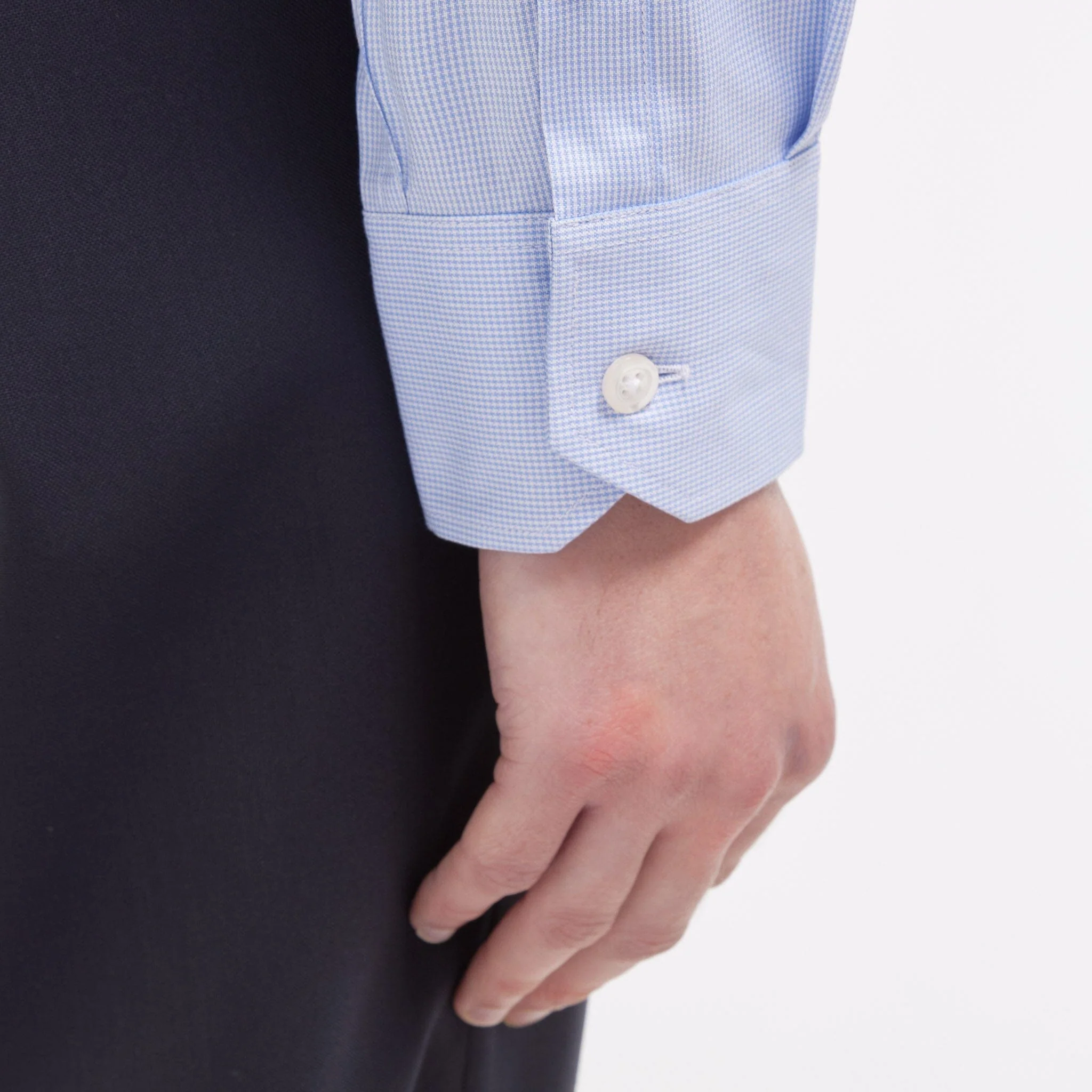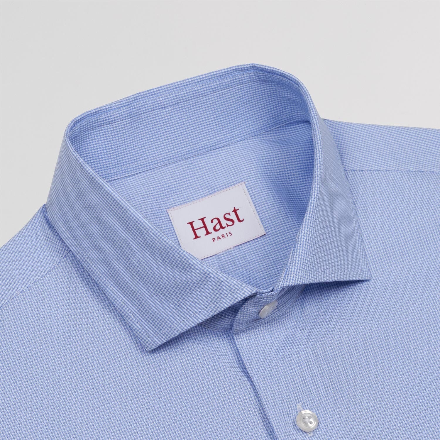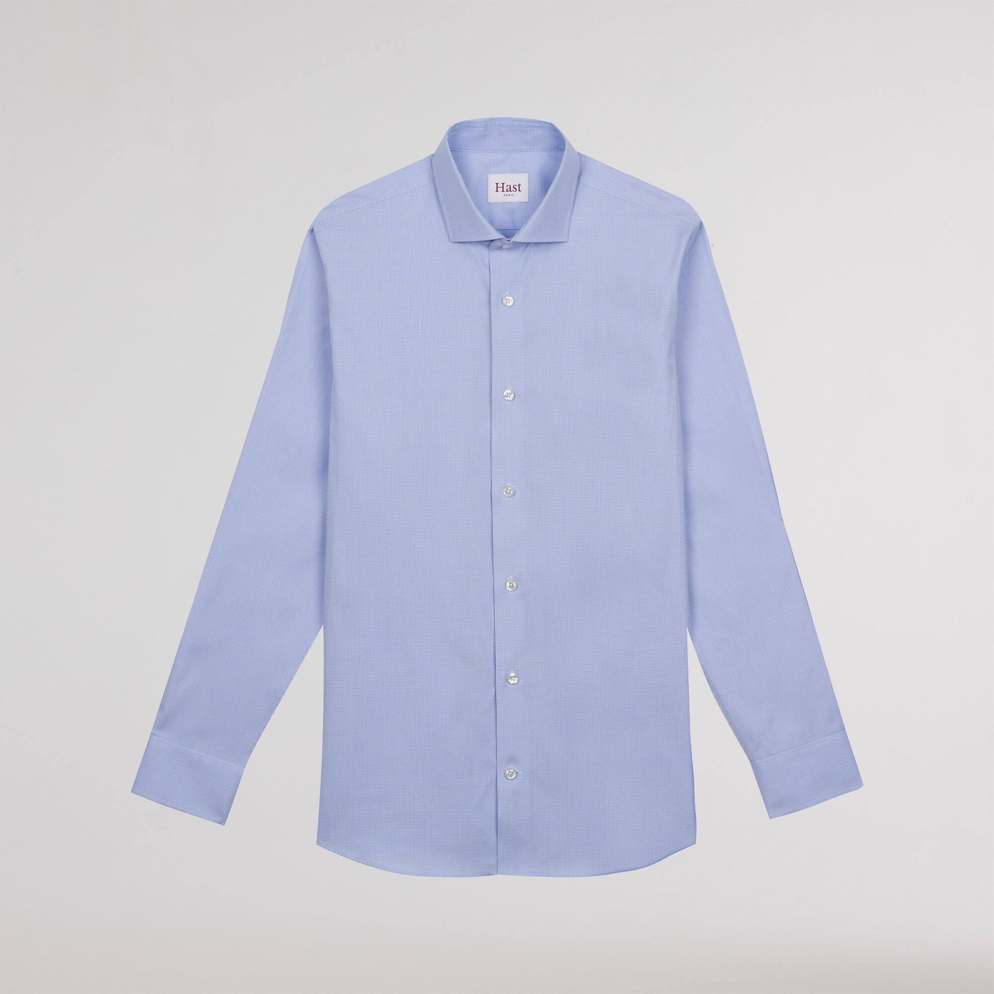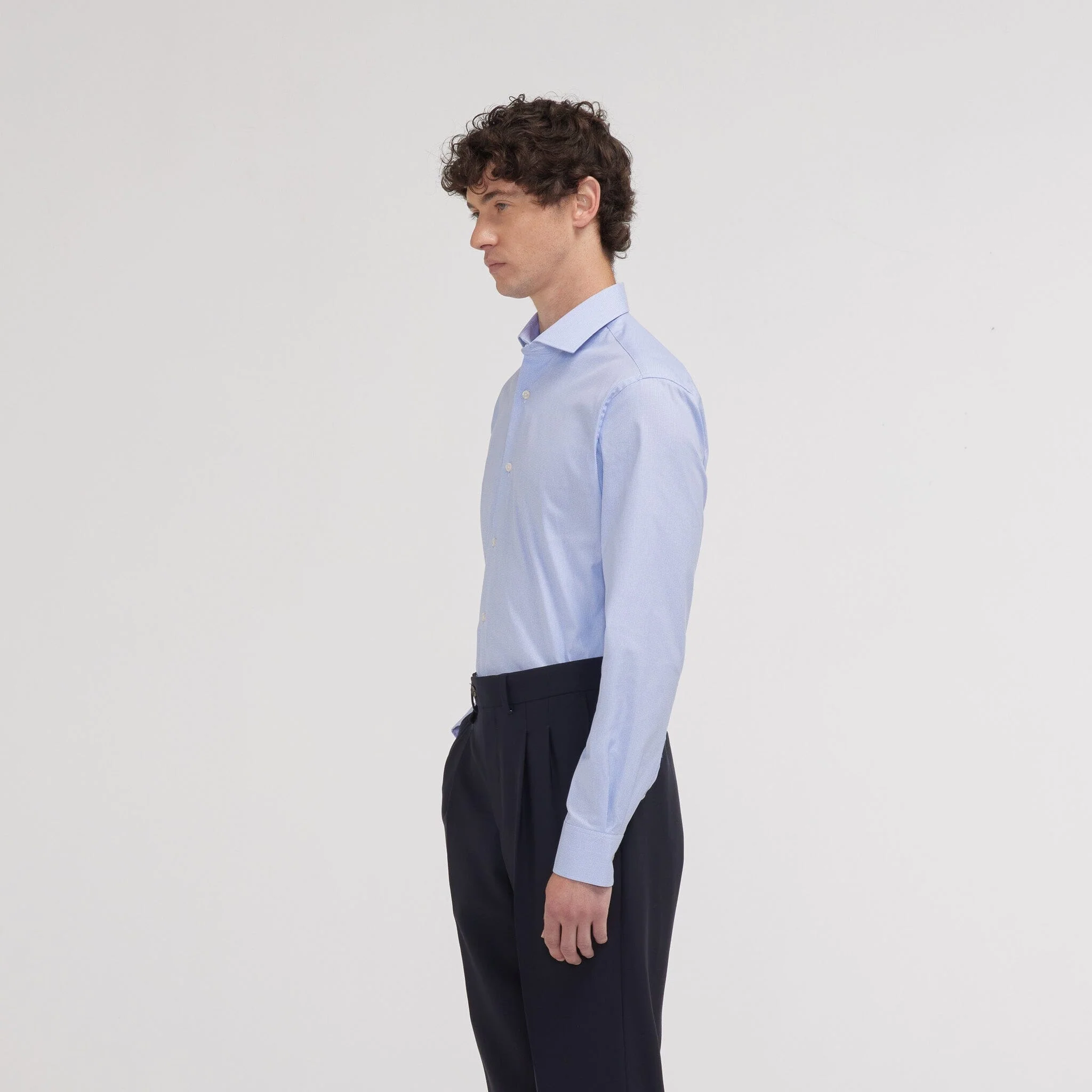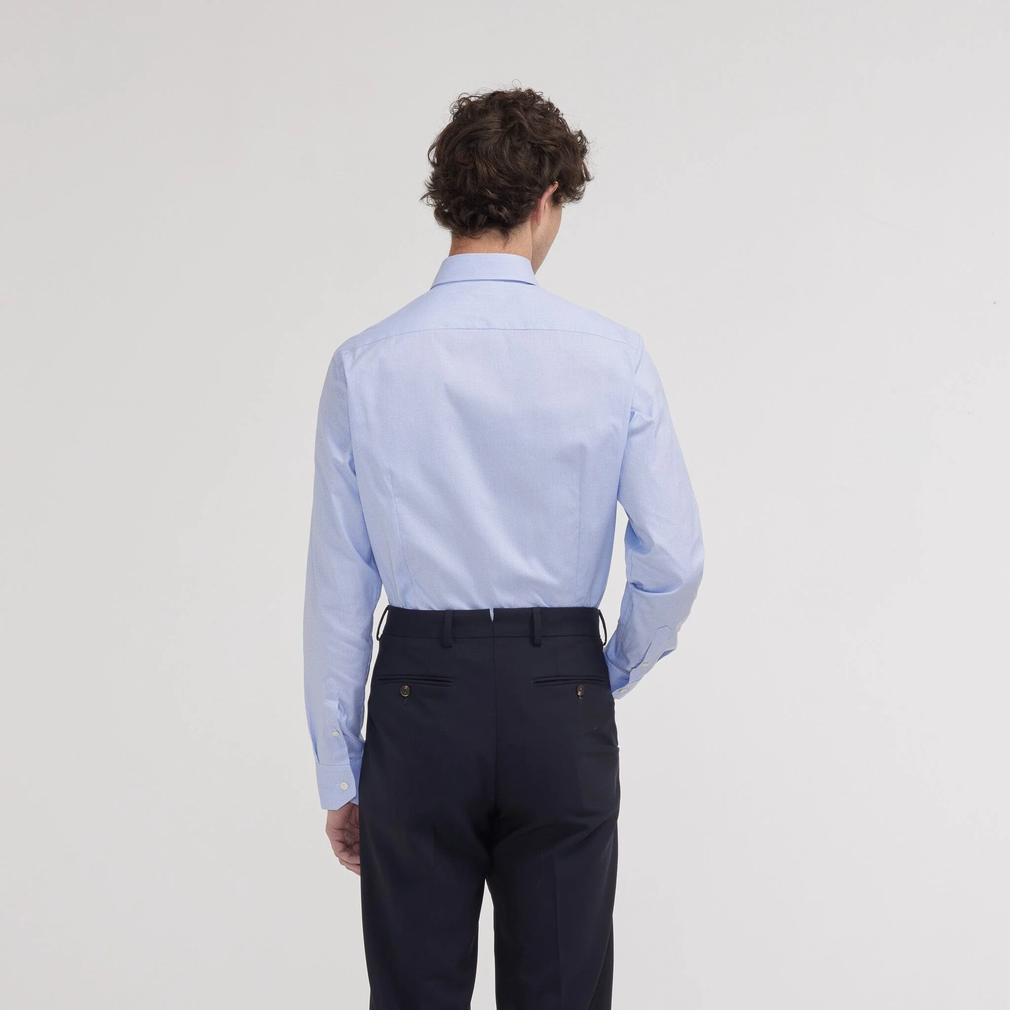 Notre chemise cintrée en oxford bleue double retors possède un motif pied de puce discret qui apporte un subtil twist à la tenue, tout en discrétion. L’utilisation du double retors permet d’avoir une chemise plus douce et plus résistante.