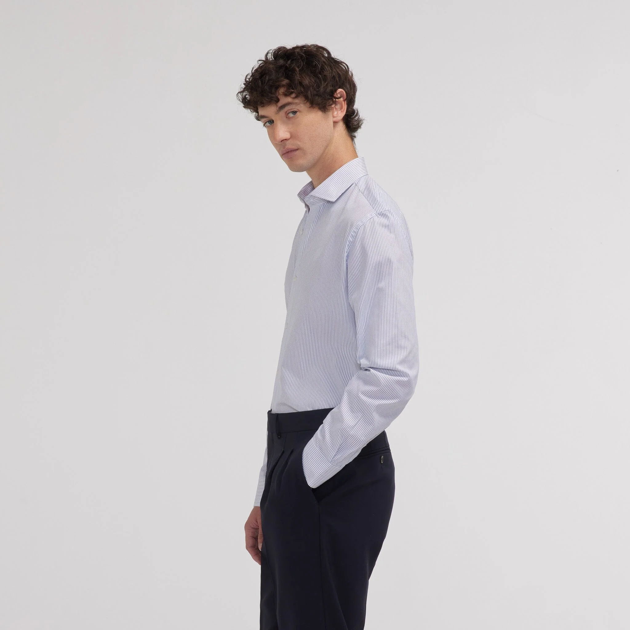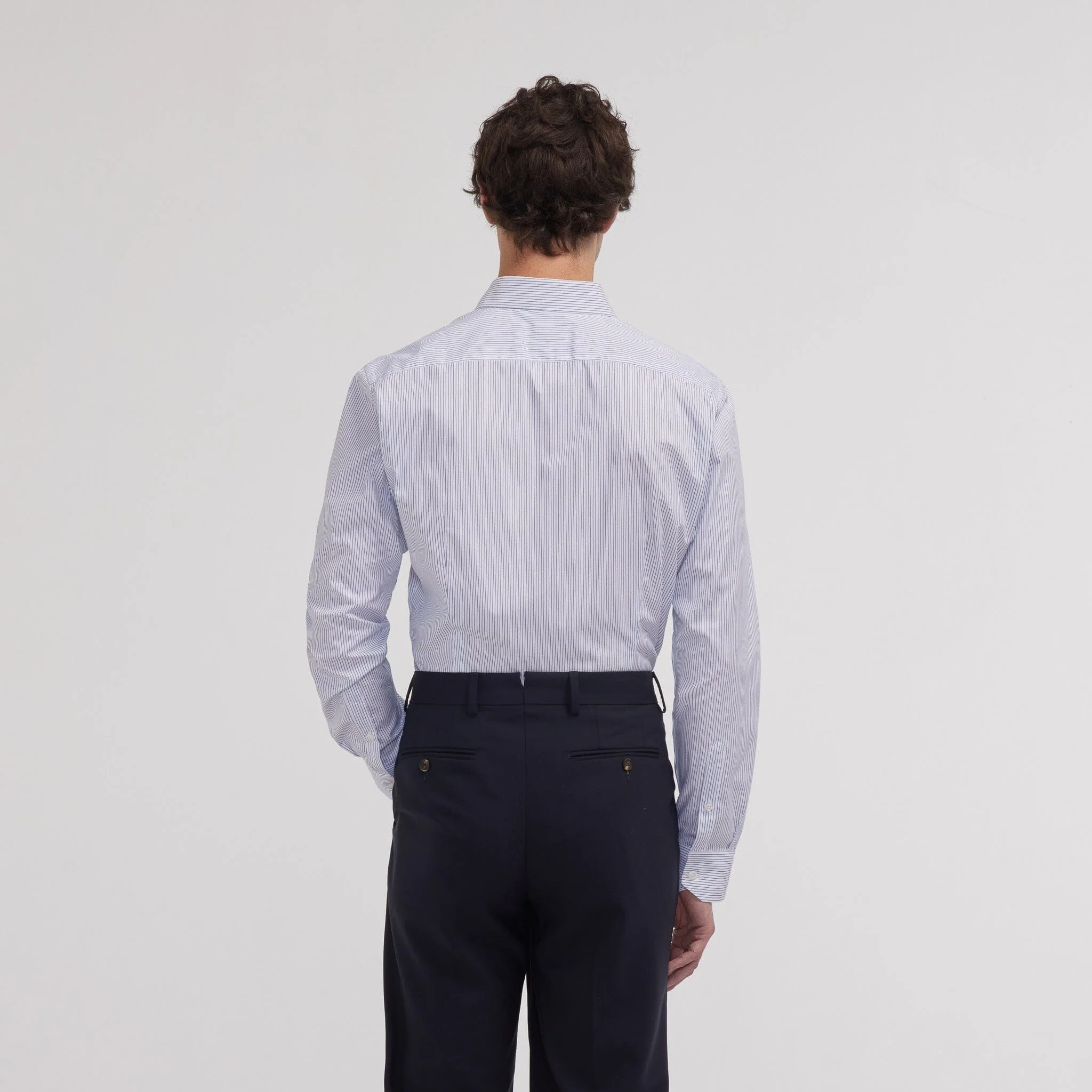 Sa coupe cintrée met en valeur les morphologies fines, tandis que notre col signature, pensé pour convenir à tous, avec ou sans cravate, apporte une touche de raffinement discret.