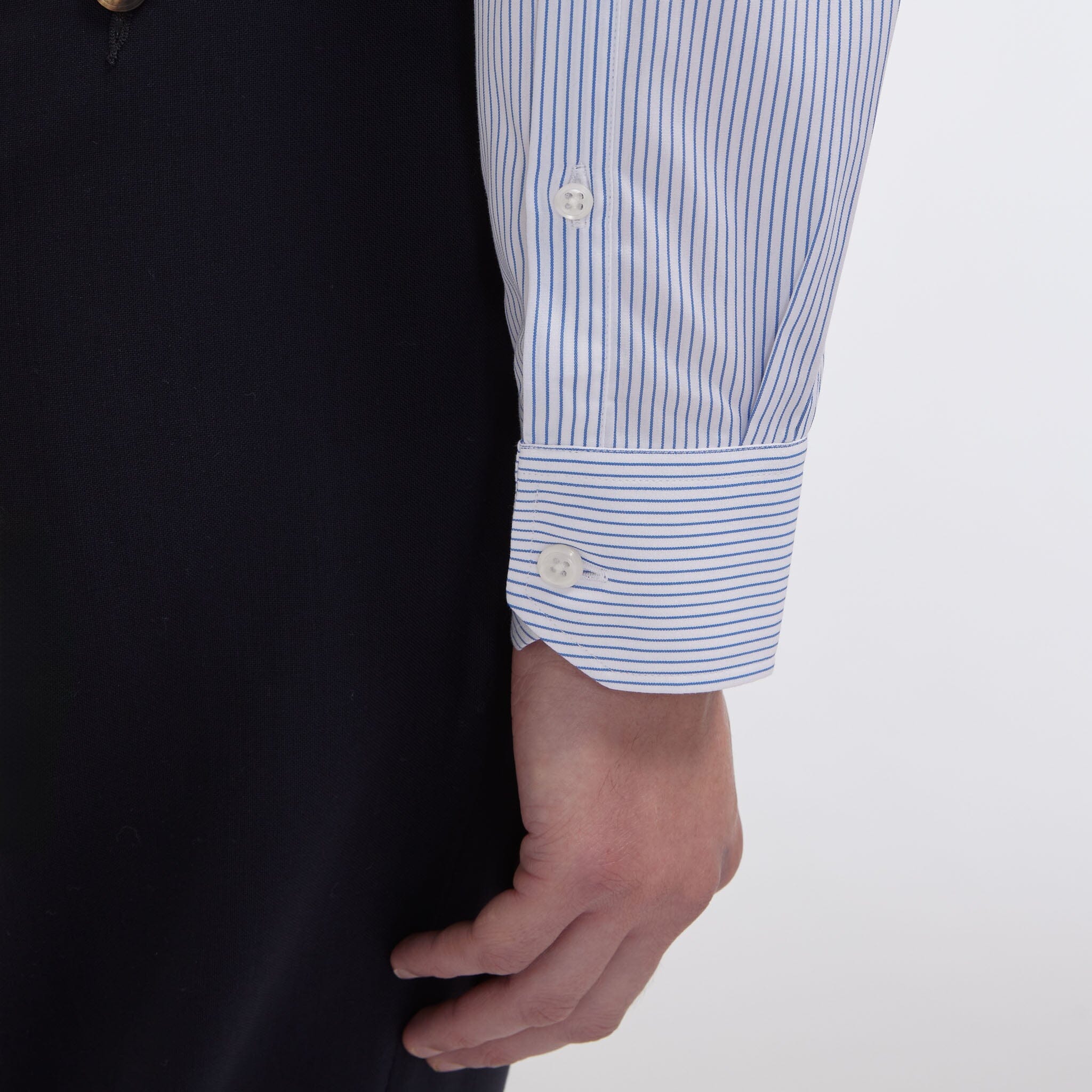 Cette chemise en popeline 100% coton double retors à fines rayures bleues est parfaite lorsque l’on souhaite ajouter du relief à sa tenue de façon subtile.