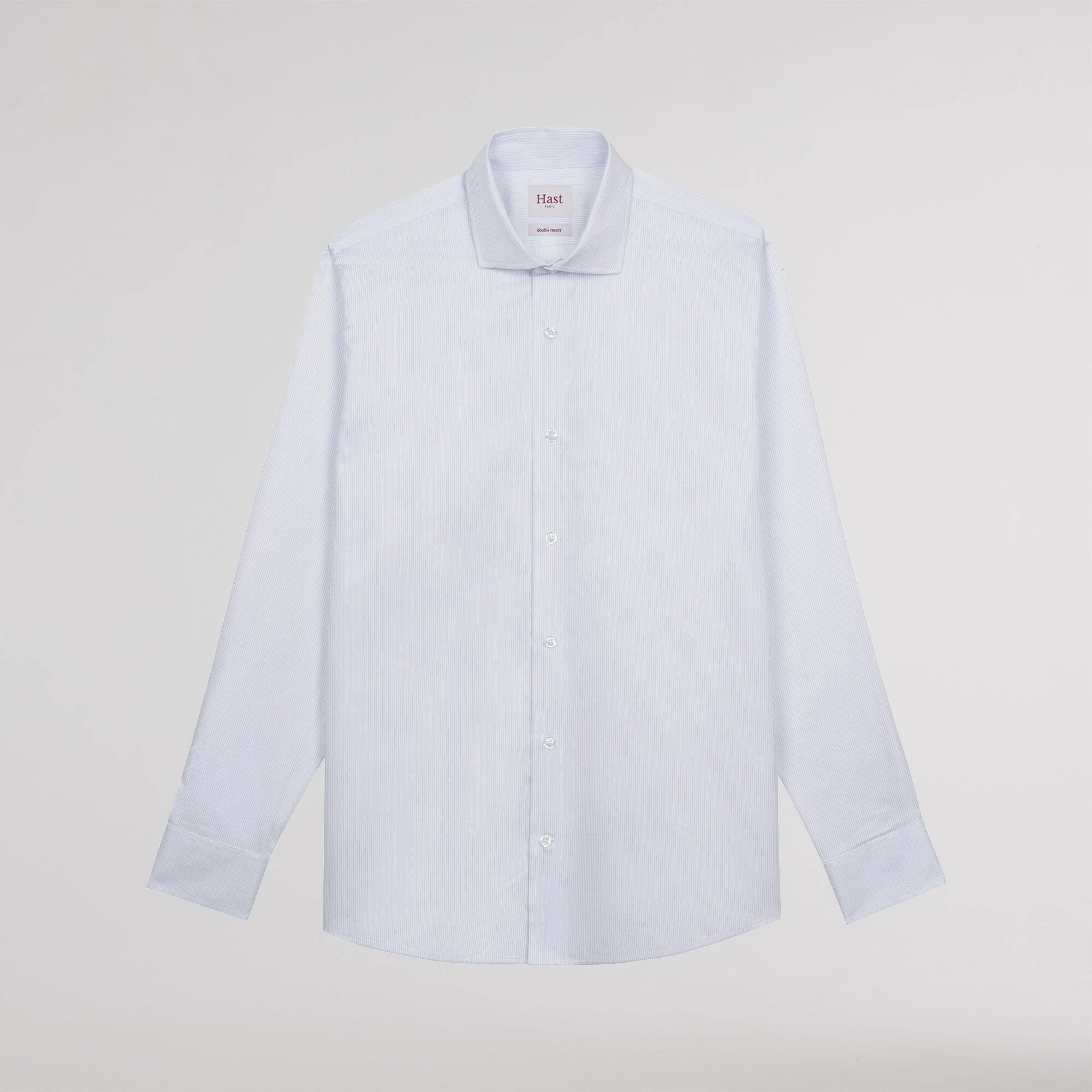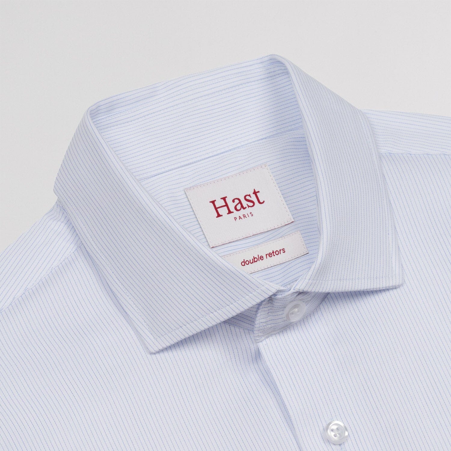 Notre chemise en twill 100% coton double retors à fines rayures bleues est parfaite lorsque l’on souhaite ajouter du relief à sa tenue de façon subtile.