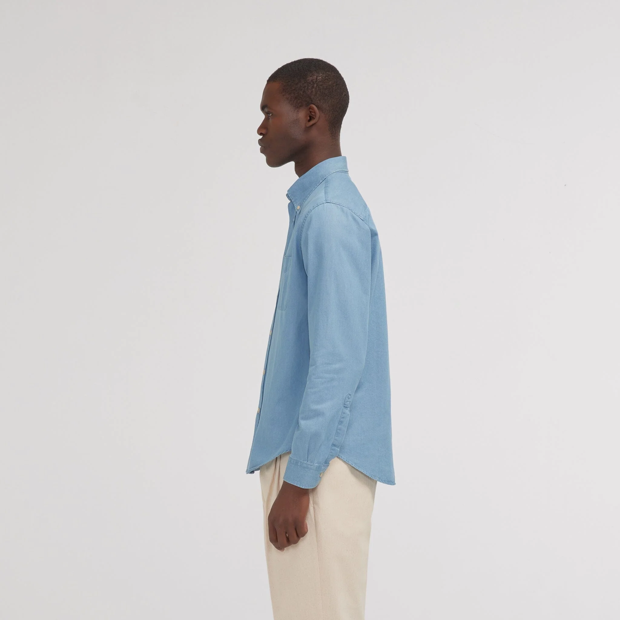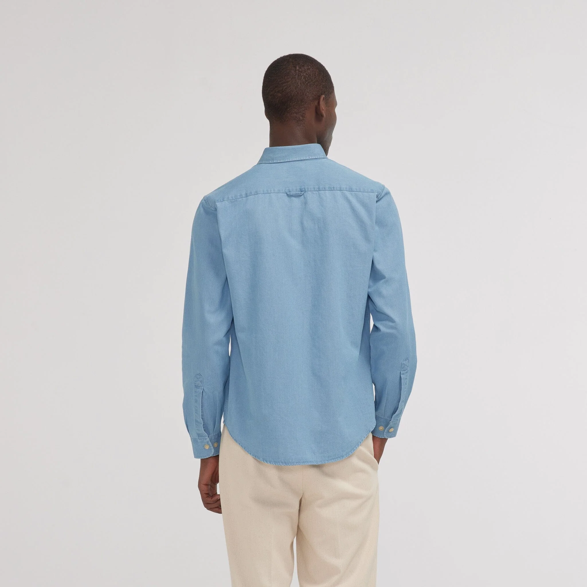 La chemise culte. L’indispensable chemise en denim bleu clair, avec une teinte lumineuse qui s’associe à toutes vos tenues, et se porte en toute saison.