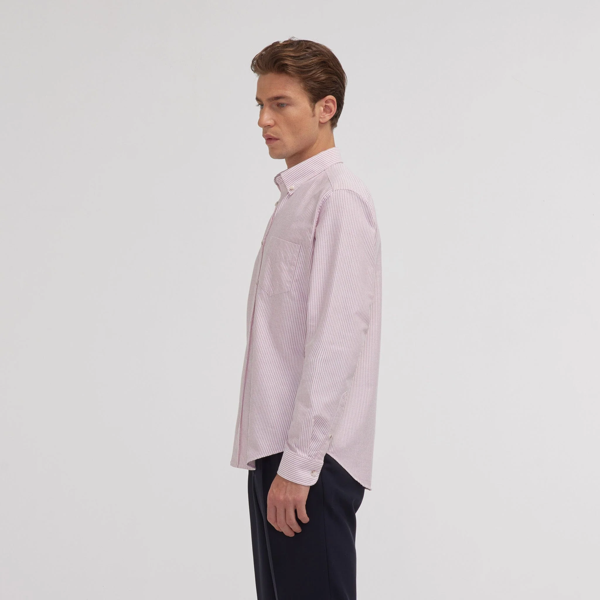 La chemise en oxford à col boutonné est un classique du vestiaire masculin. C’est la chemise la plus facile à associer avec vos différents vêtements. L’oxford est un tissu très résistant avec une belle texture, tandis que les rayures amènent du relief à la tenue.