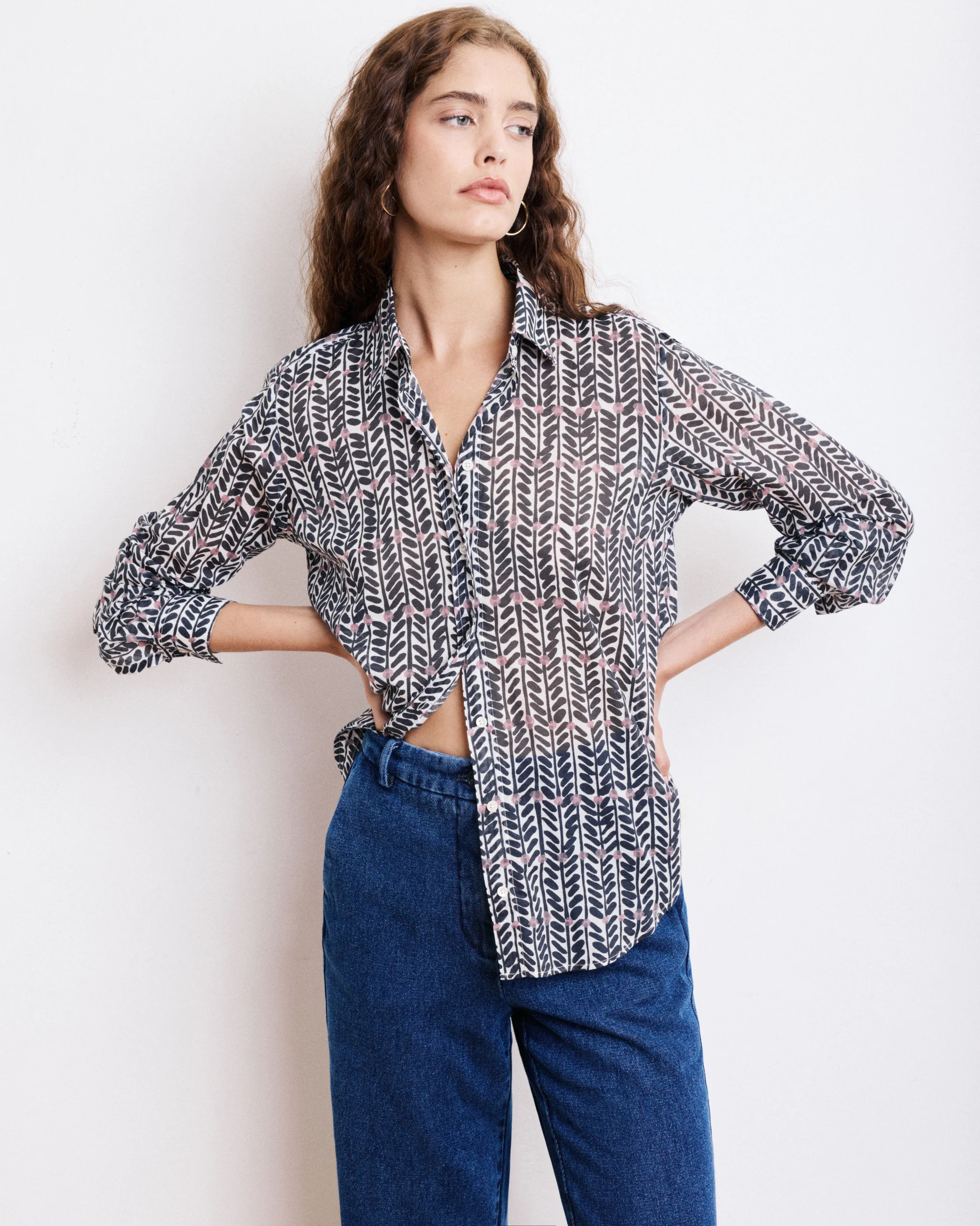 Chemise femme ajustée en voile de coton imprimé exclusif. Patte de boutonnage apparente avec boutons en nacre. Pli d’aisance au dos.