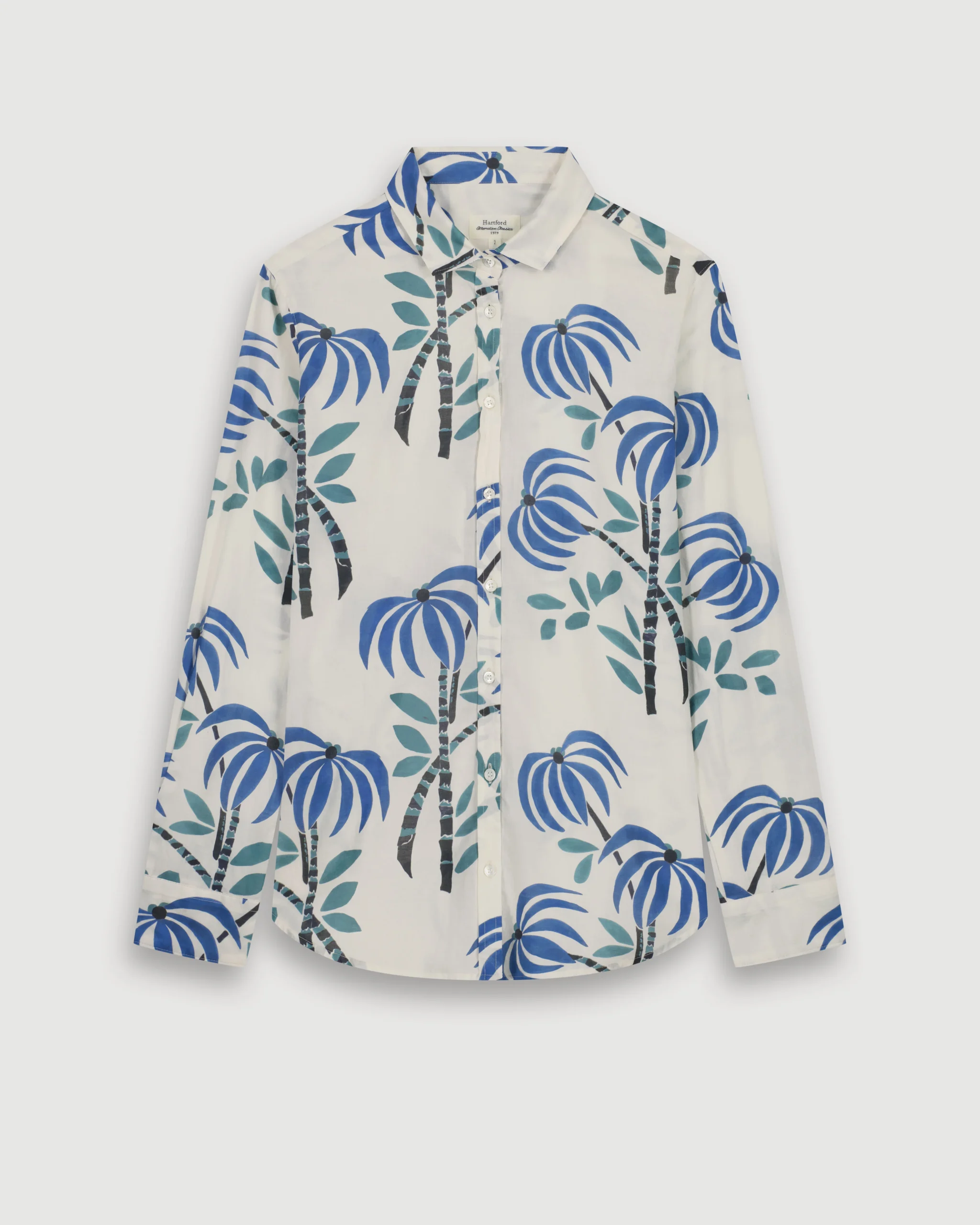 Chemise femme iconique en coton imprimé exclusif Palmiers. Légèrement cintrée avec un petit col et une patte de boutonnage apparente. Boutons en nacre.