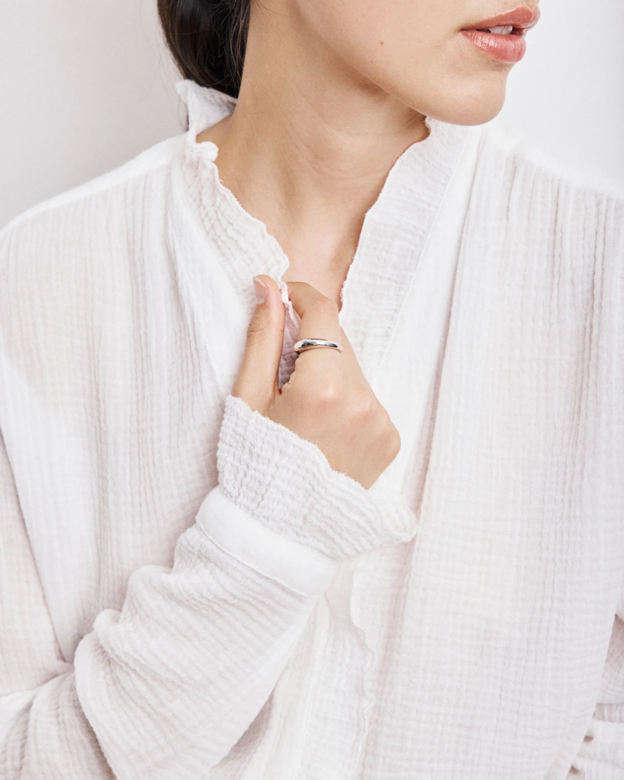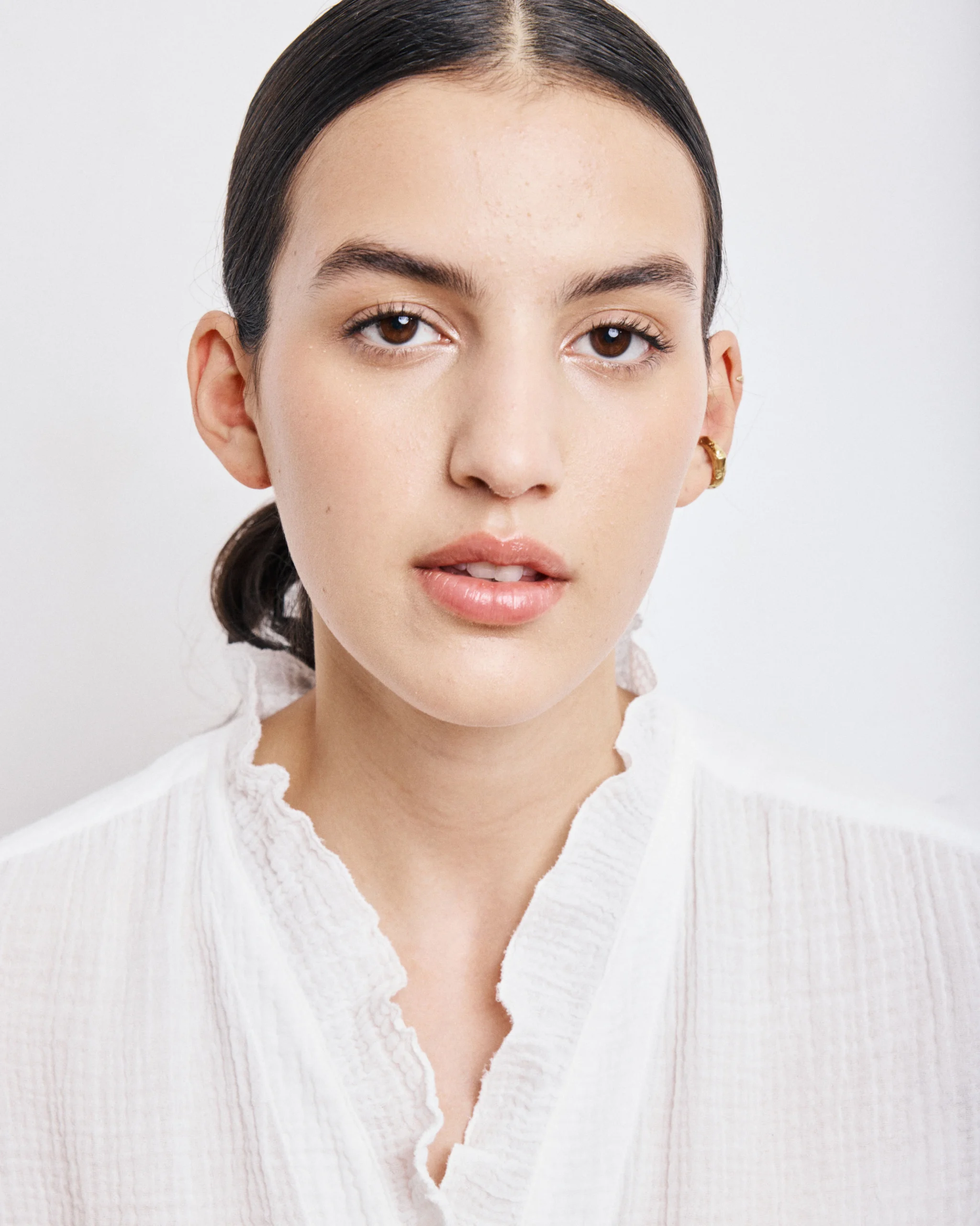Chemise femme ample en gaze de coton légère à manches longues. Col à volants, emmanchures tombantes et patte de boutonnage invisible avec boutons en nacre. Finitions volantées aux poignets et fronces délicates aux épaules.