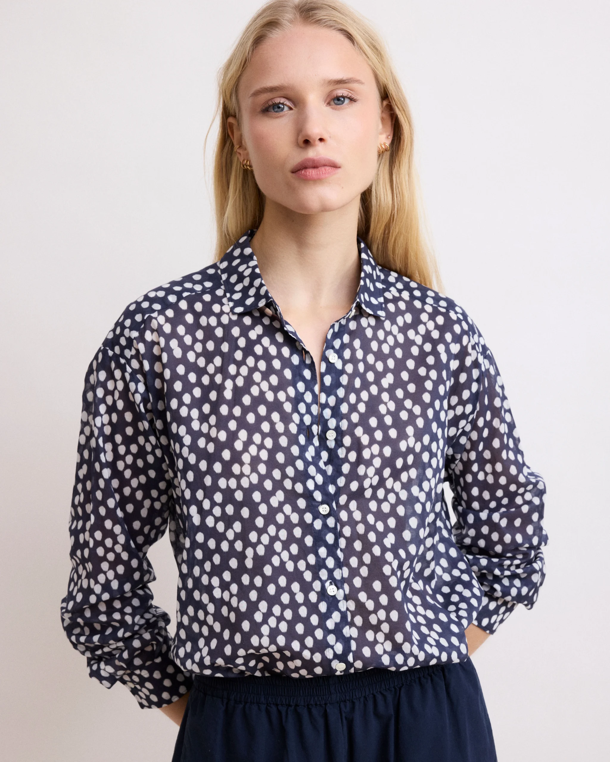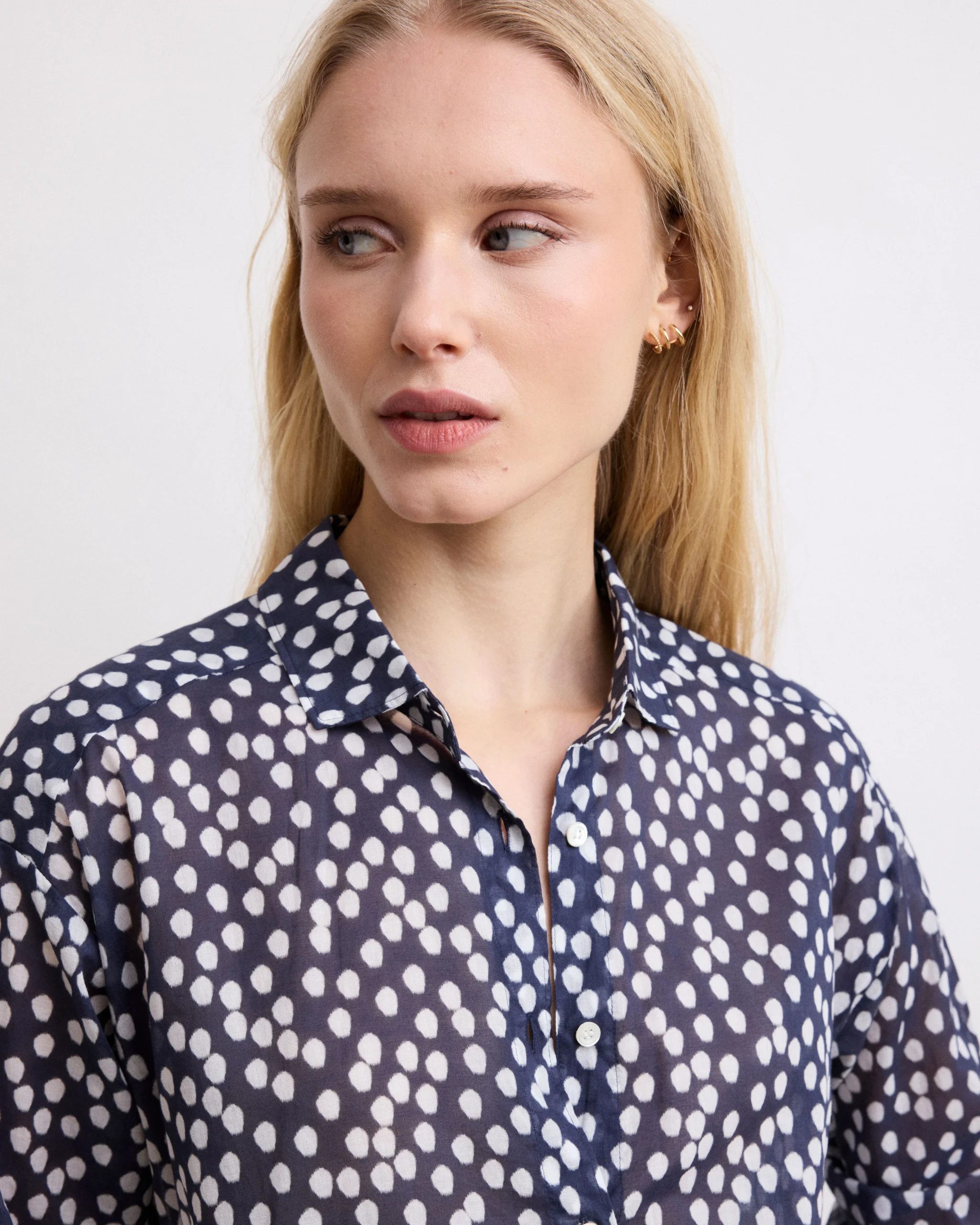 Chemise femme ample en voile de coton imprimé exclusif à pois irréguliers. Emmanchure tombante et patte de boutonnage apparente avec boutons en nacre.