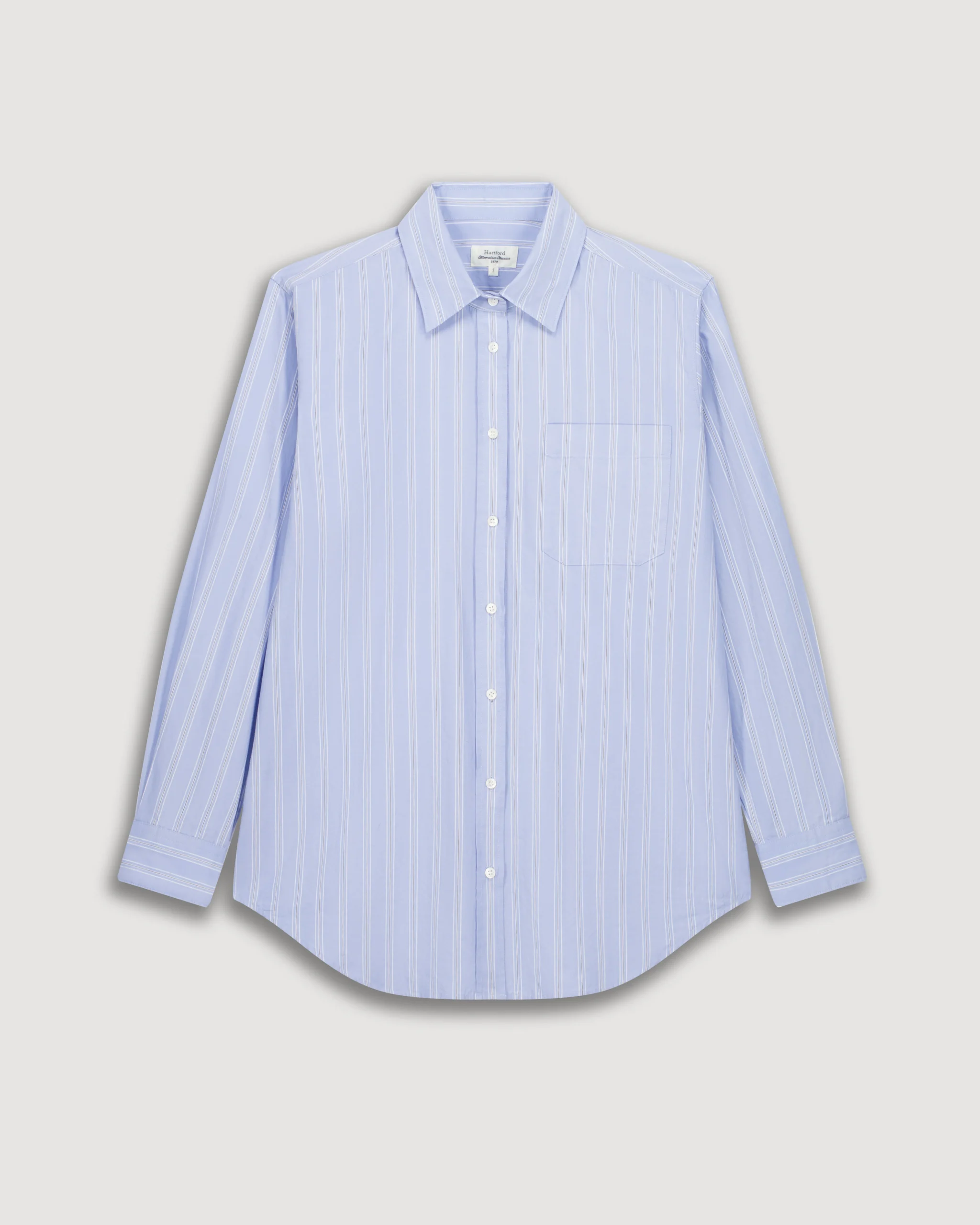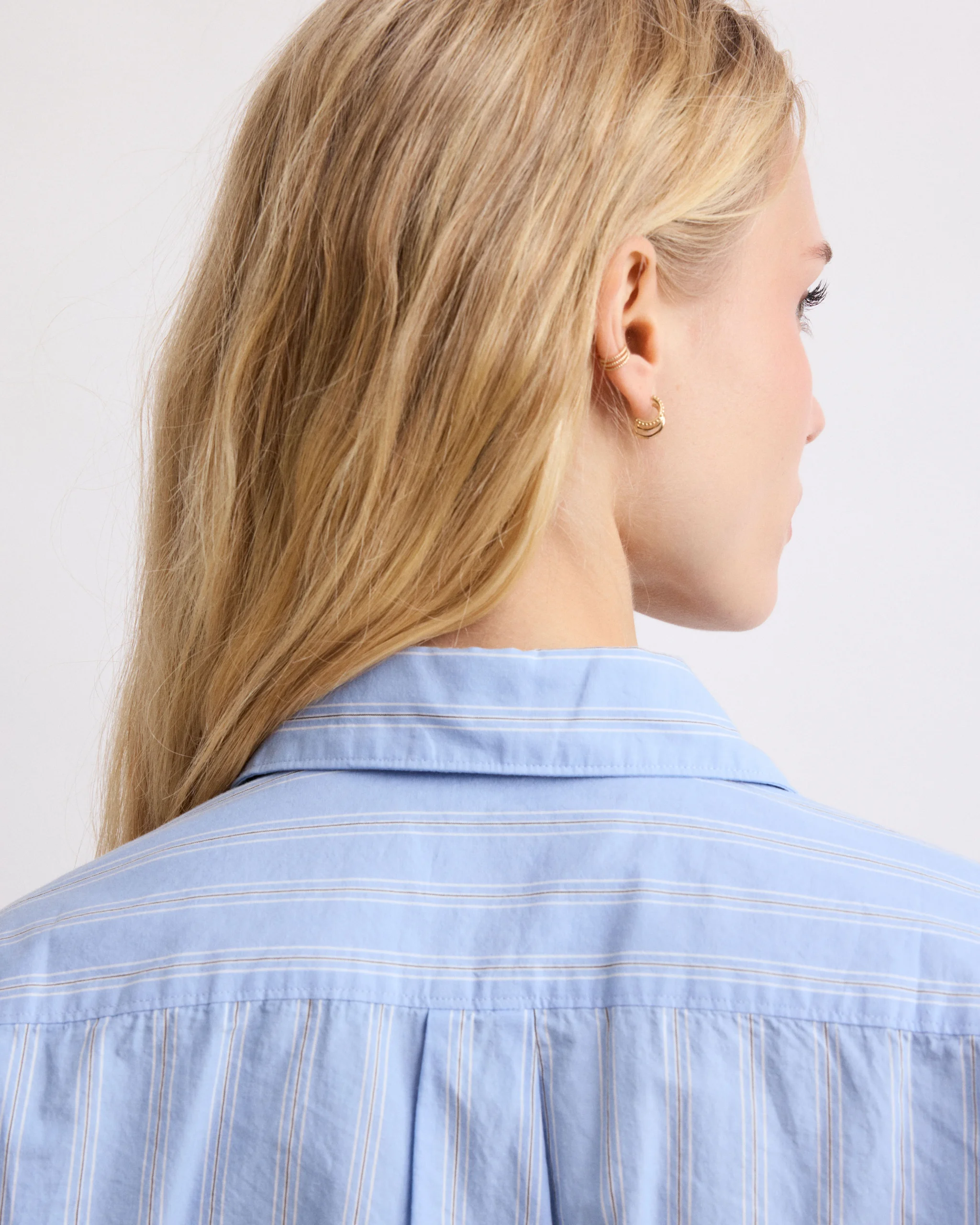 Chemise femme ample en voile de coton rayé. Poche poitrine et manches longues à poignets simples. Patte de boutonnage apparente avec boutons en nacre. Plis d’aisance au dos.