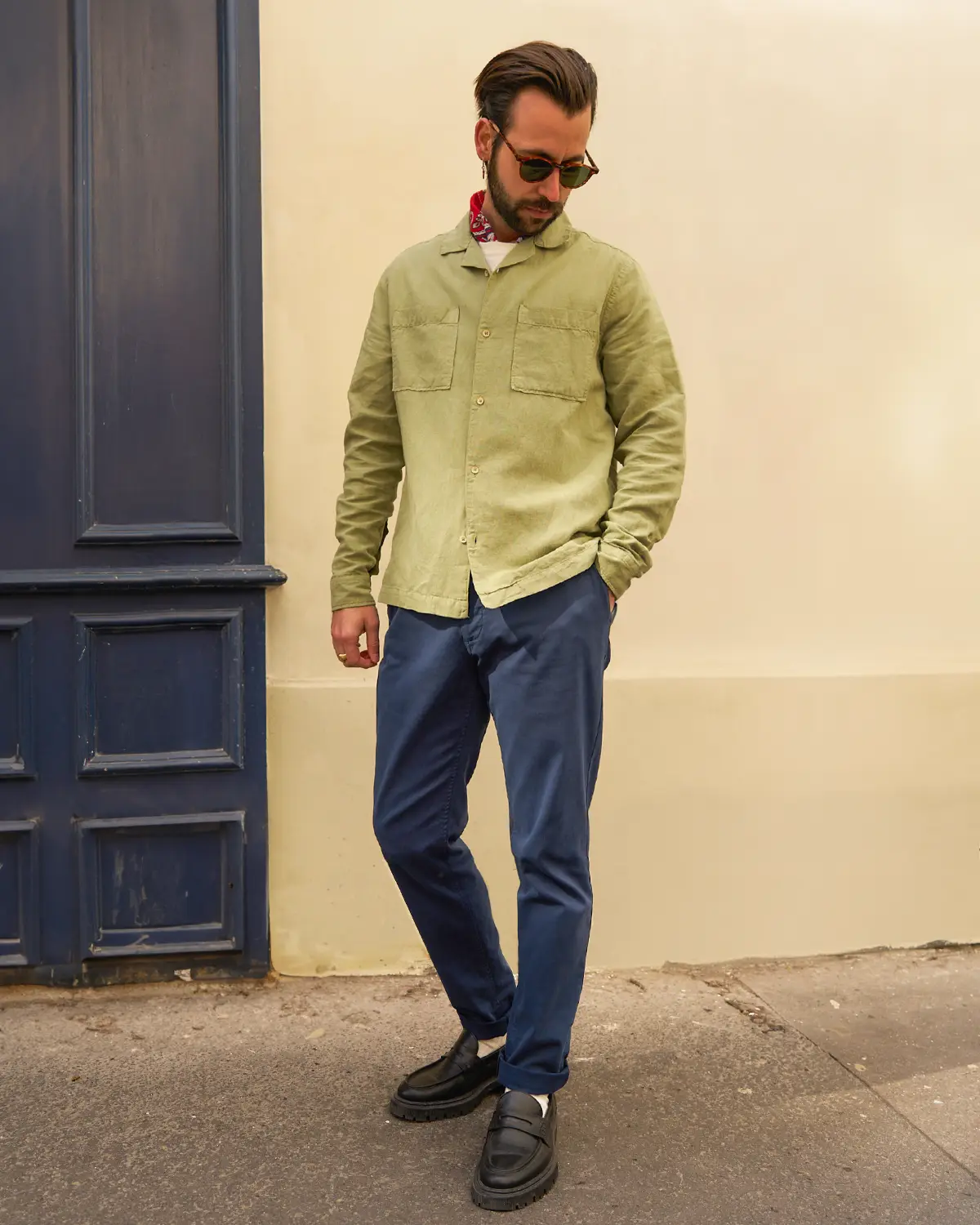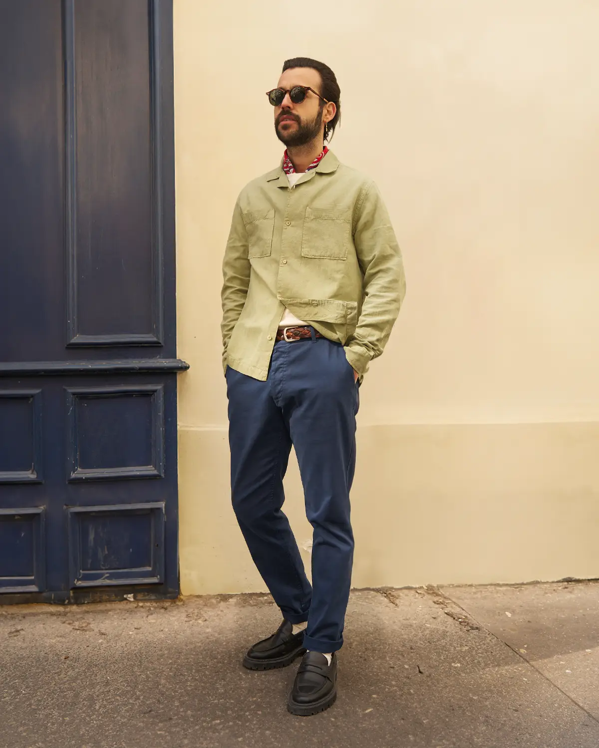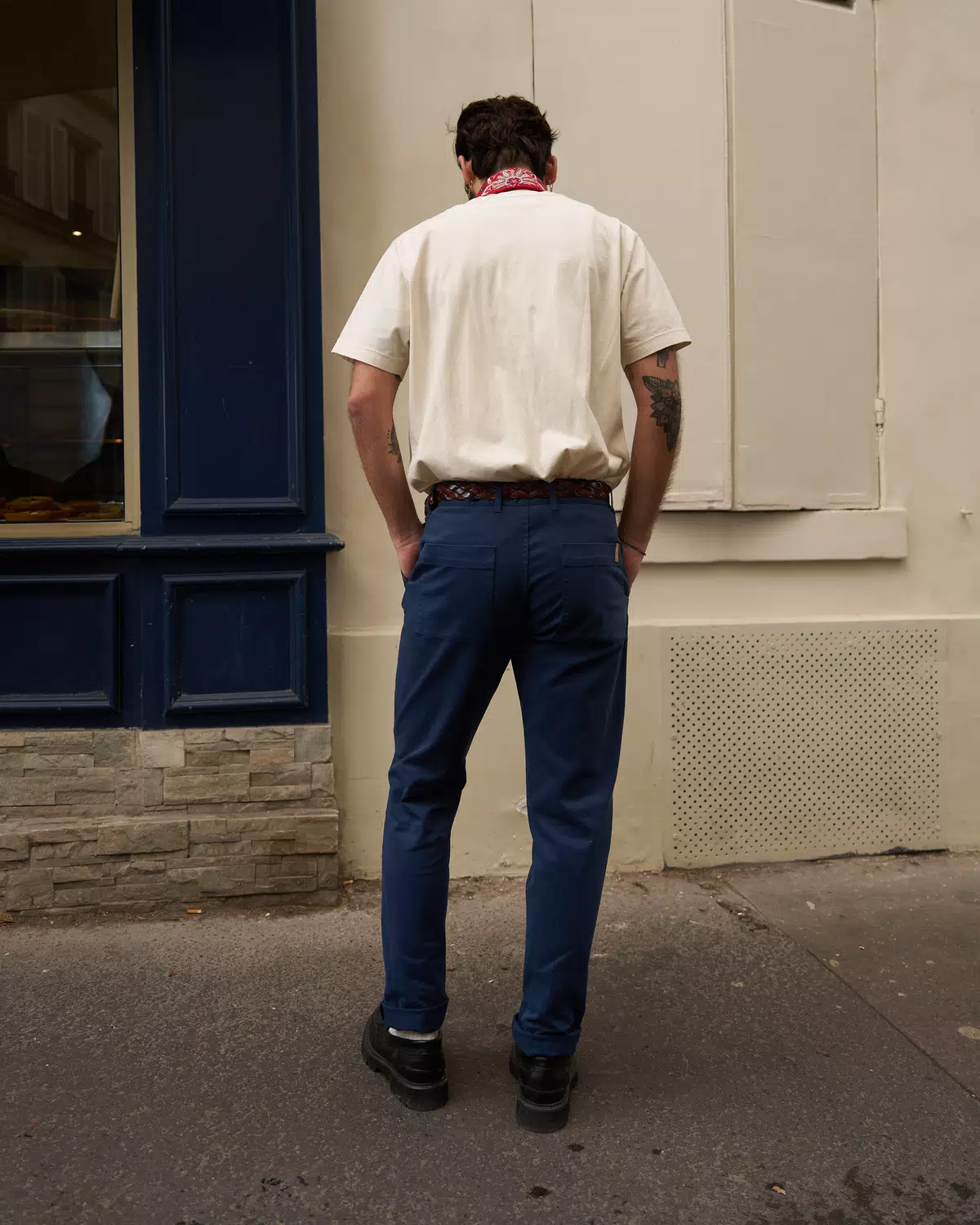 Un chino indémodable bleu marine. Deux poches italiennes fidèles à l’esprit chino. Une coupe légèrement loose et un tombé impeccable, puisque vous aurez choisi la longueur qui vous convient par 62 combinaisons de tailles et longueurs.