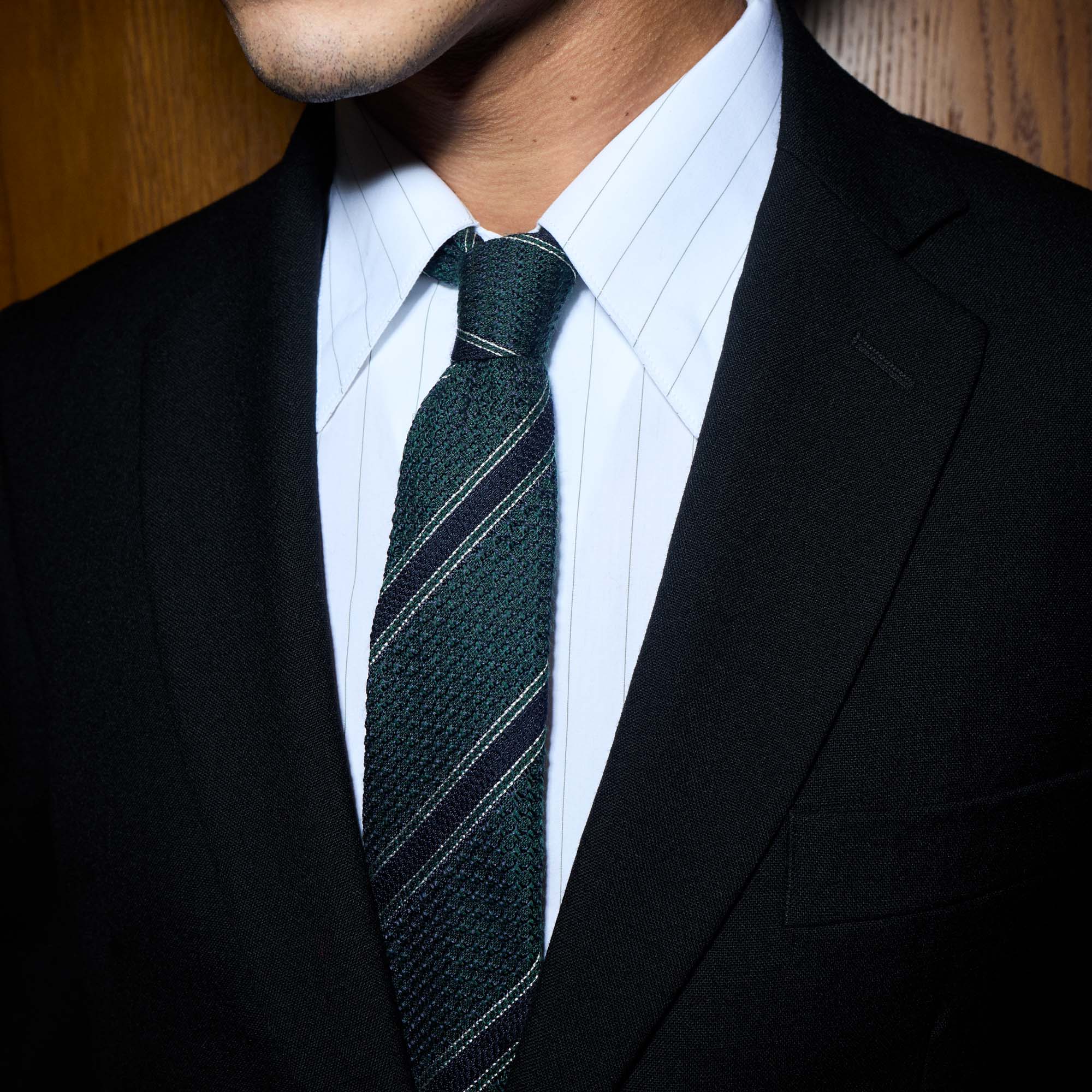 La grenadine de soie est toujours un excellent choix lorsqu’il s’agit de porter une cravate. Conçue sur d’anciens métiers à tisser, elle donne de la texture à la cravate. En rouge, elle se marie parfaitement avec du marine, du gris ou du beige.