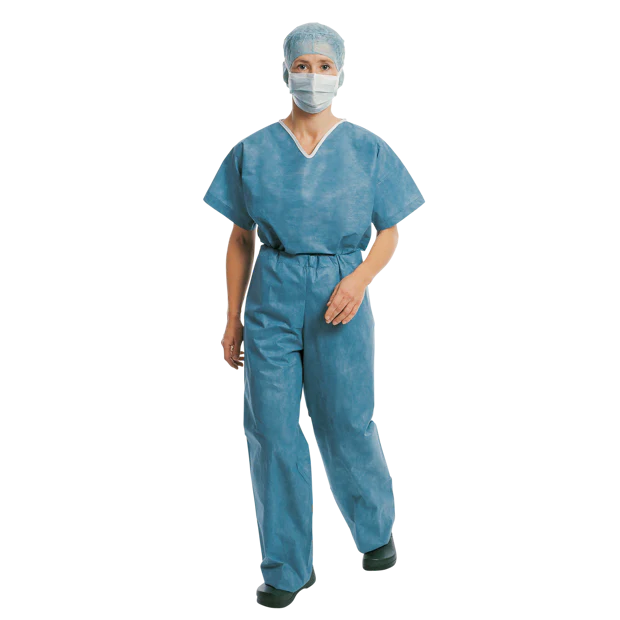 Vêtement chirurgical non stérile à usage unique en deux parties, en tissu non tissé respirant et hydrofuge, très résistant à la pénétration de l’humidité et à la migration des germes, résistant à l’abrasion et à faible peluchage, tunique avec col en V, manches courtes et poche ; pantalon à coupe droite avec bande de cravate à la taille, emballé par paire, disponible en trois couleurs.