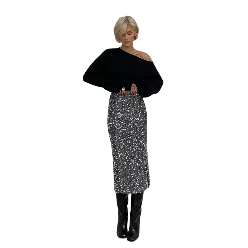 Divine dans cette magnifique jupe mi-longue à paillettes fendues ! On craque pour son design légèrement révélateur qui vous met en valeur. Elle a tout ce qu’il faut pour entrer directement dans votre garde-robe ! Facile à associer avec un pull décolleté ou un top glamour ! Pour parfaire votre look de fille classe, enfilez votre plus belle paire de talons, et vous voilà prête à sortir plus sexy que jamais !