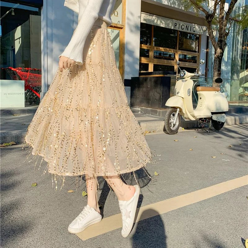 Jupe Paillette Franges Taille Haute