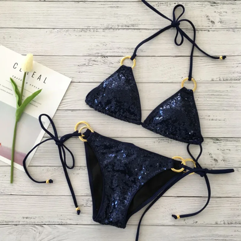 Soyez sensuelle et sexy dans ce maillot de bain deux pièces pailleté qui fera de vous la reine de la plage. Vous attirerez tous les regards grâce à l’éclat de ses paillettes et de ses couleurs chatoyantes. Ce maillot de bain est de qualité supérieure grâce à son tissu résistant et extensible, et son haut est rembourré pour un meilleur maintien et un décolleté charmant.