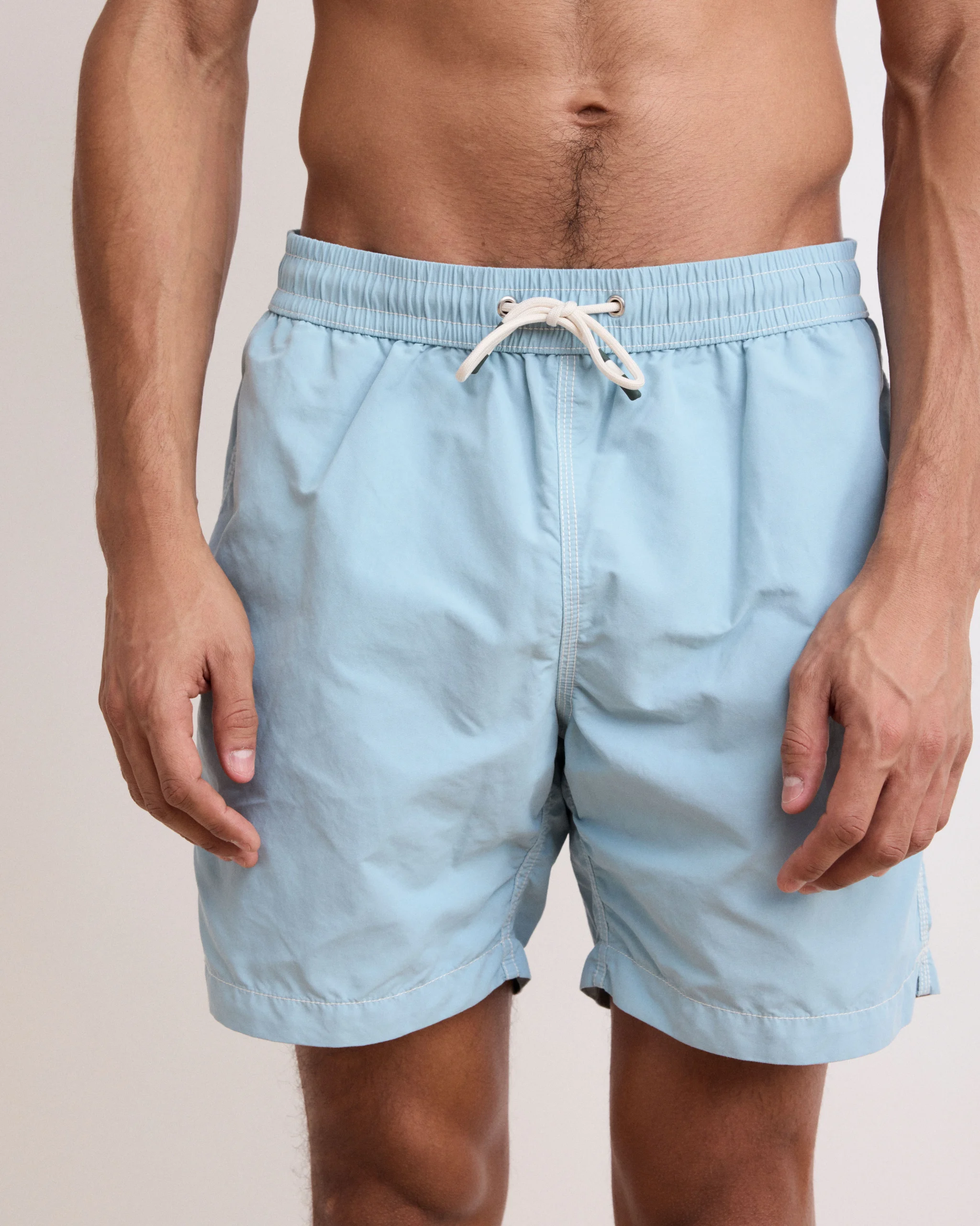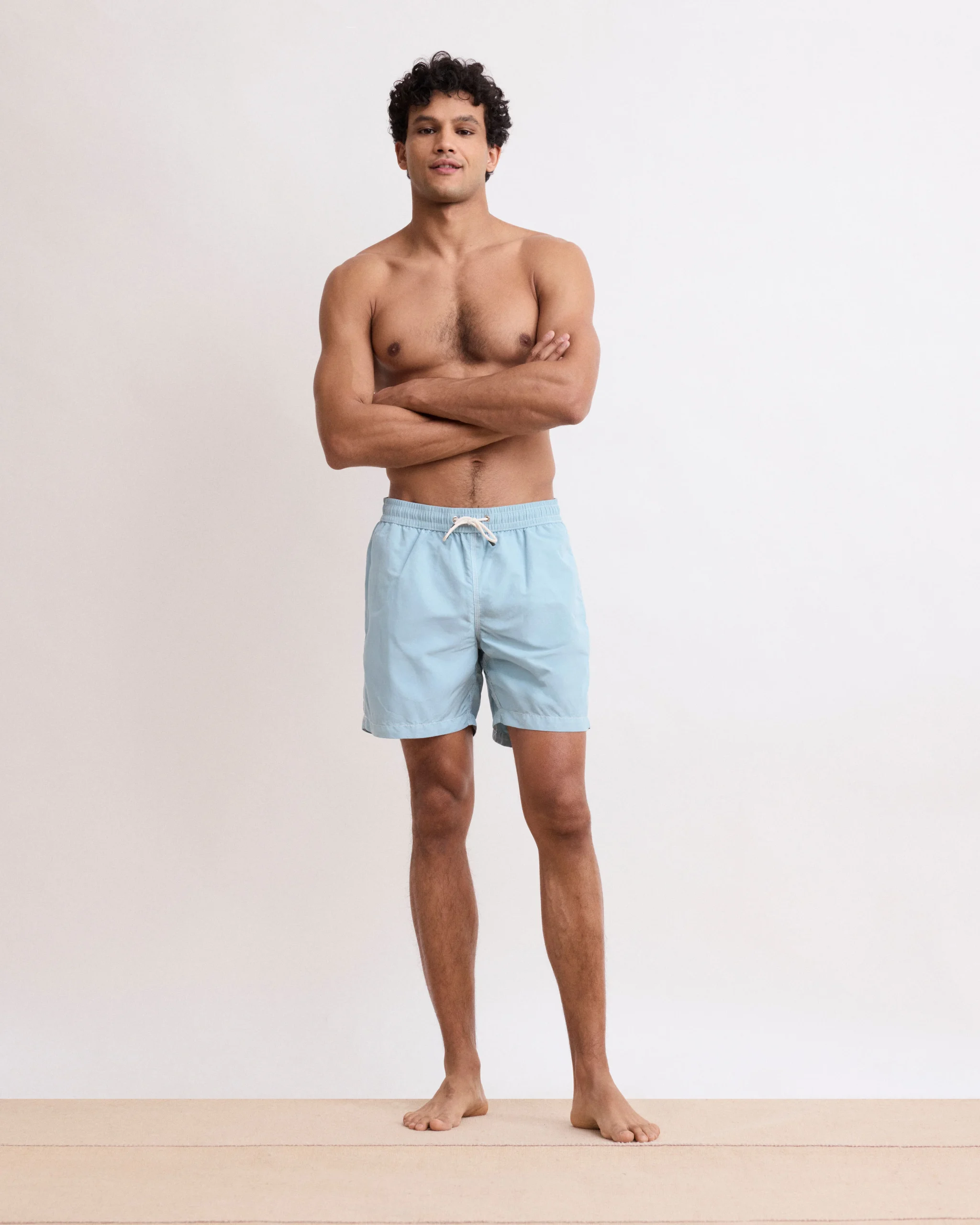 Maillot de bain enfant garçon à taille élastique avec cordon de serrage et poche à rabat dans le dos, coupe mi-longueur.