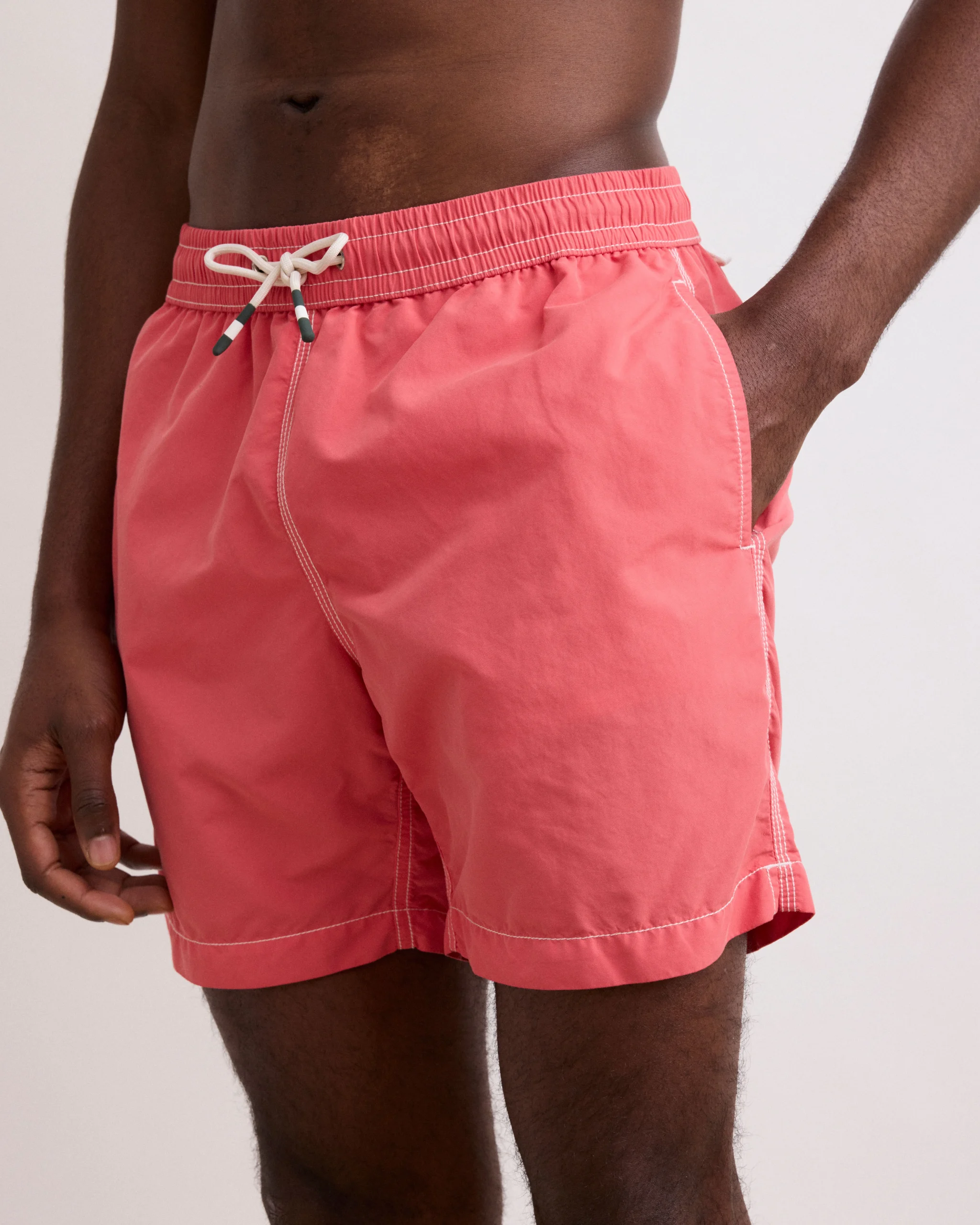 Maillot de bain enfant garçon à taille élastique avec cordon de serrage et poche à rabat dans le dos, coupe mi-longueur.