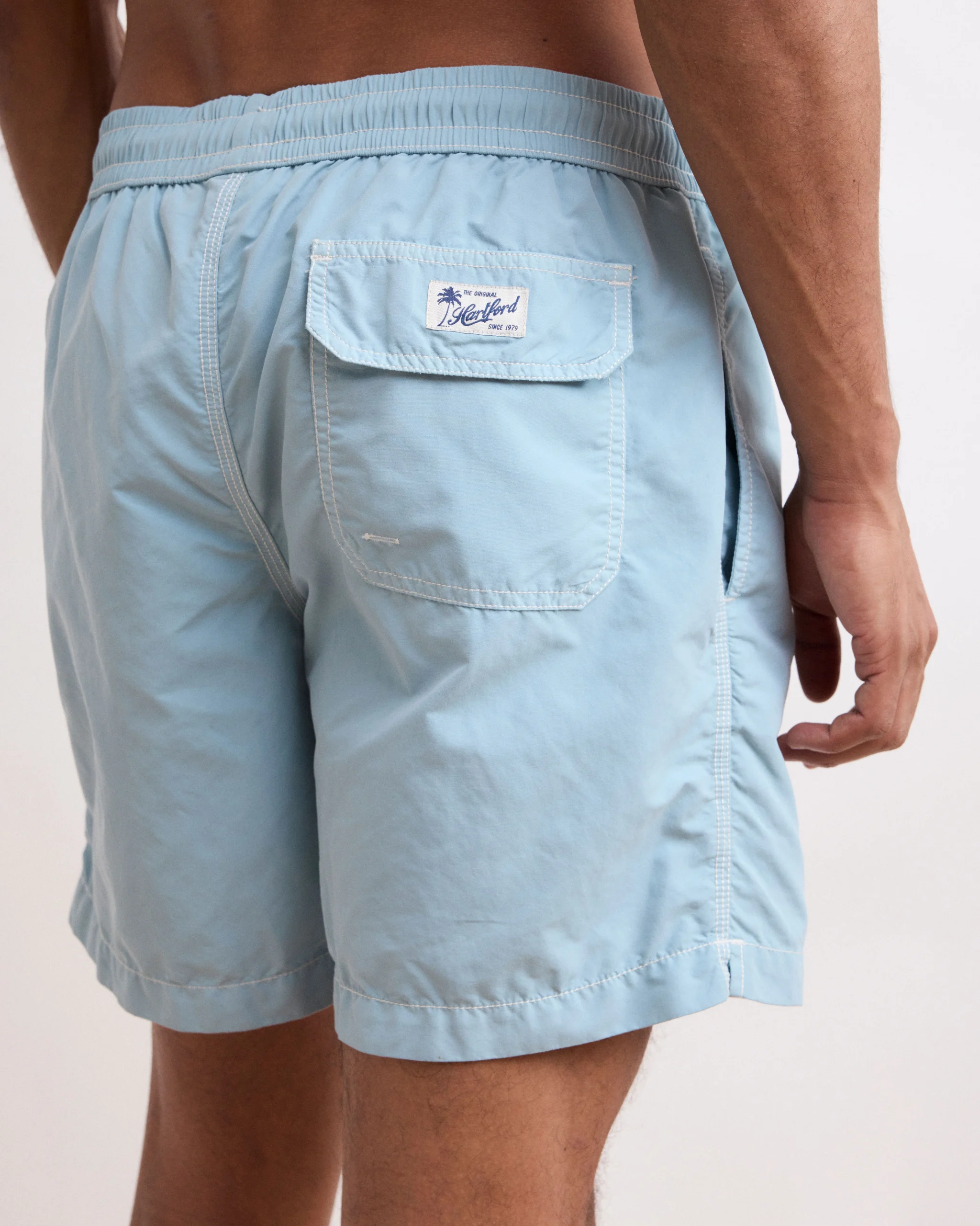 Maillot de bain homme emblématique Hartford, le SWIM est un short de bain mi-longueur avec deux poches sur les côtés et une poche arrière. Sa taille élastique s’ajuste avec les cordons.