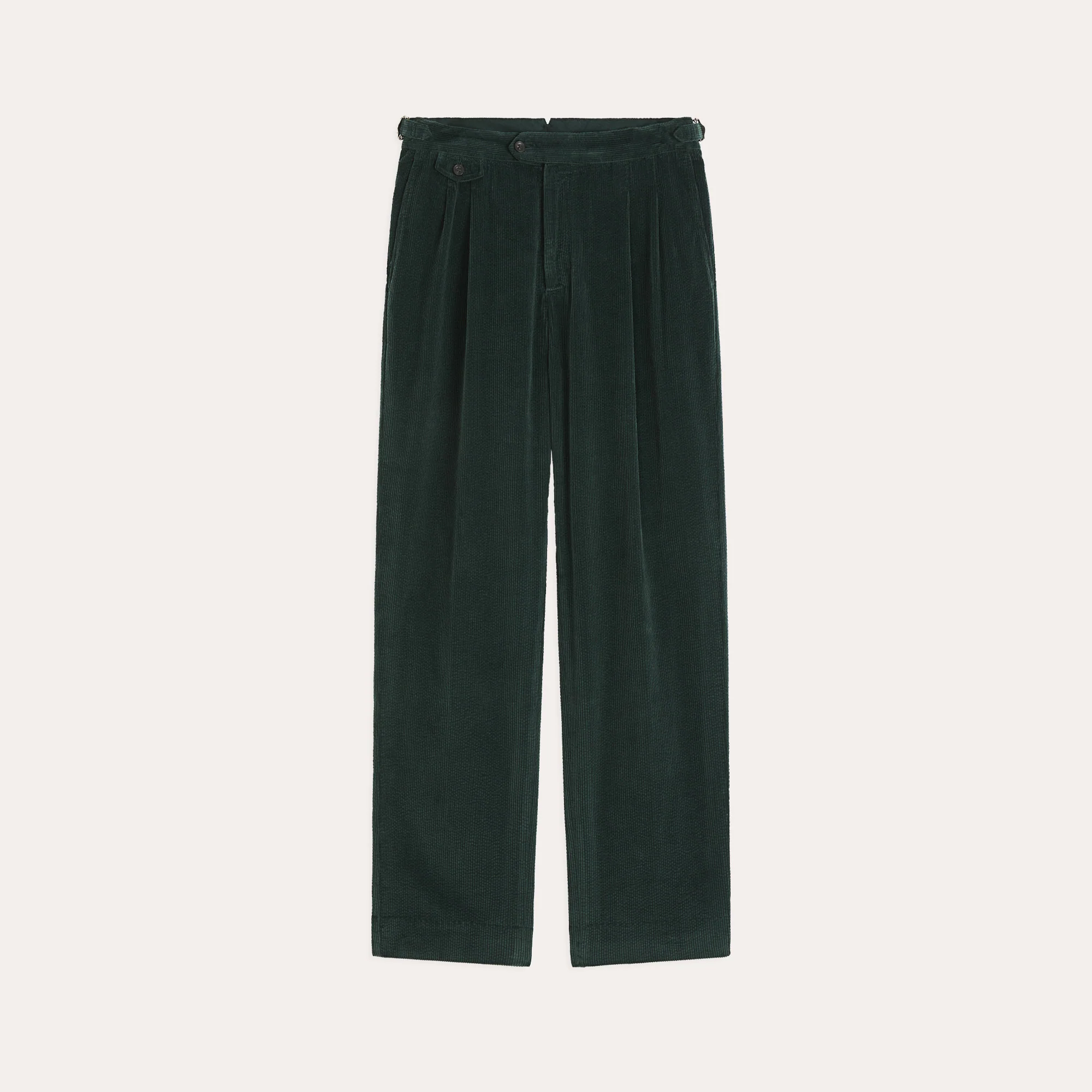 La toile de ce pantalon en velours italien vert 100% coton possède une texture rare évoquant le seersucker grâce à son aspect gauffré. Nous avons poussé le raffinement jusqu’aux pattes de serrage latérales qui rendent la ceinture optionnelle, une coupe droite impeccable, et une ceinture à boutonnage décalé — autant de détails malins qui font toute la différence.