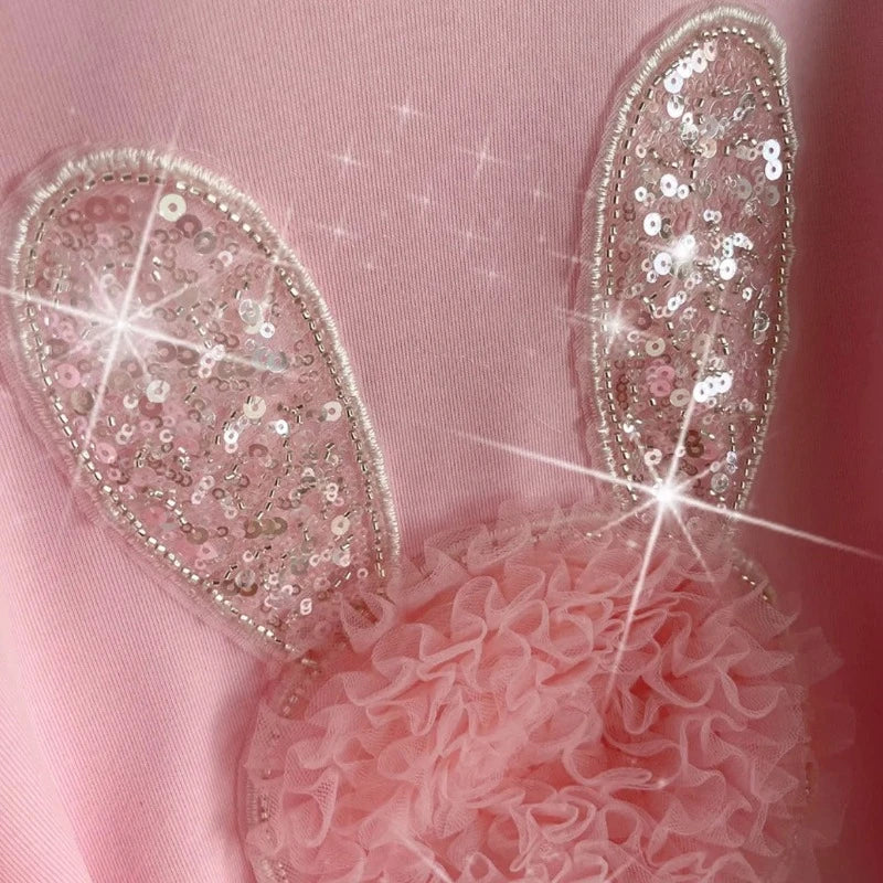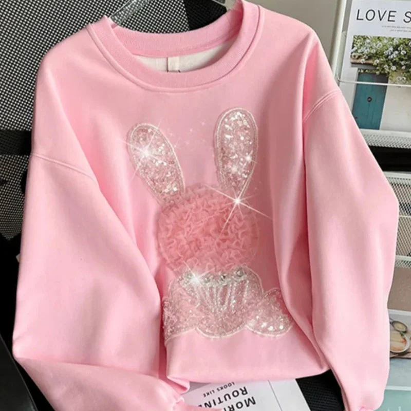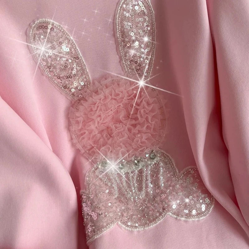 Imaginez un Pull Rose Paillette Strass Lapin. Une pièce douce et étincelante avec un adorable motif de lapin en strass, qui apportera une touche de charme à votre dressing. On peut voir sur ce pull une couleur rose tendre qui évoque la douceur et la féminité.