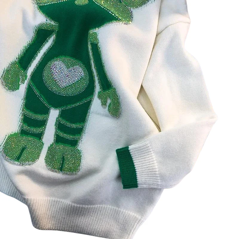 Adoptez un look original et décontracté avec ce Pull Strass Laine Personnage joliment tricoté. Il est fabriqué en laine naturelle et durable, pour une sensation de douceur et de confort sur la peau. Sa coupe élégante lui confère un look chic et moderne. Ce pull à la mode ravira toutes celles qui le porteront. Vous adorerez son joli personnage pailleté ! A porter avec un jean et des baskets compensées à paillettes.