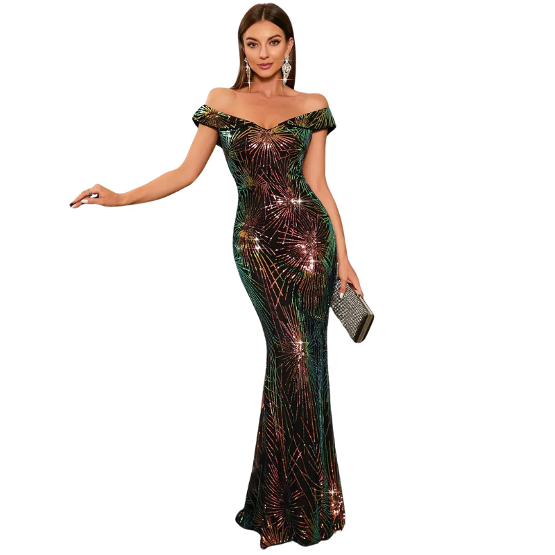Cette robe de soirée à paillettes colorées fera sensation lors de vos réceptions et galas, son allure respirant l’élégance et la sensualité. Sa coupe longue et sirène dévoilera les moindres courbes de votre corps, ses épaules ouvertes révéleront la finesse de vos épaules et son design graphique vous fera briller comme un feu d’artifice !