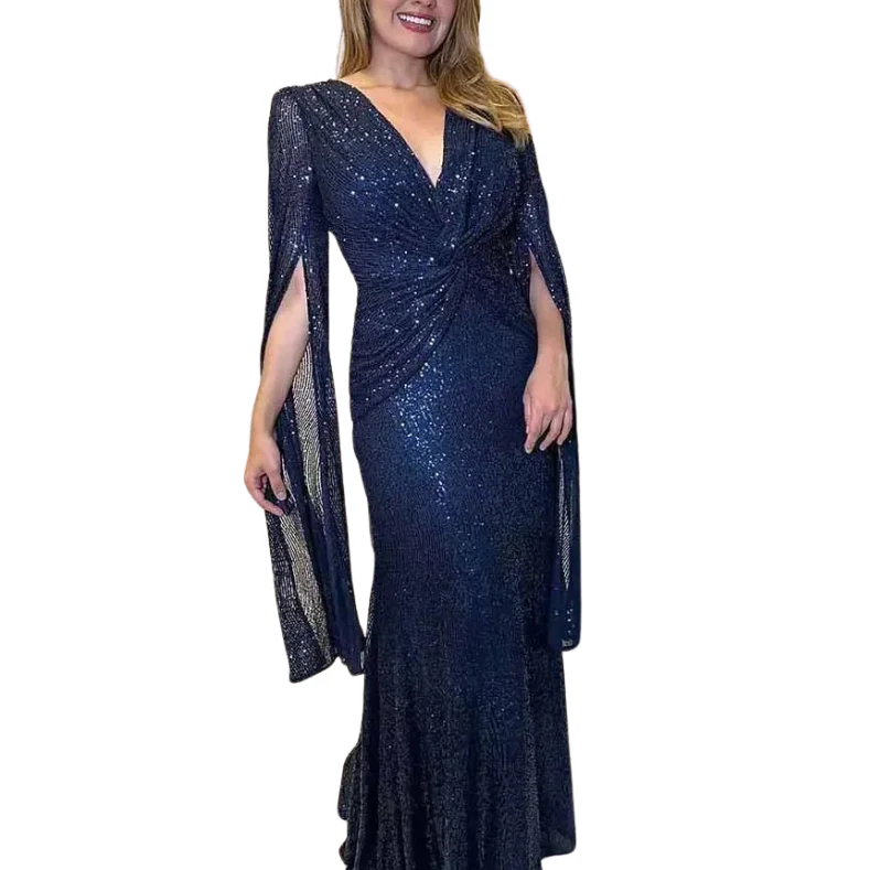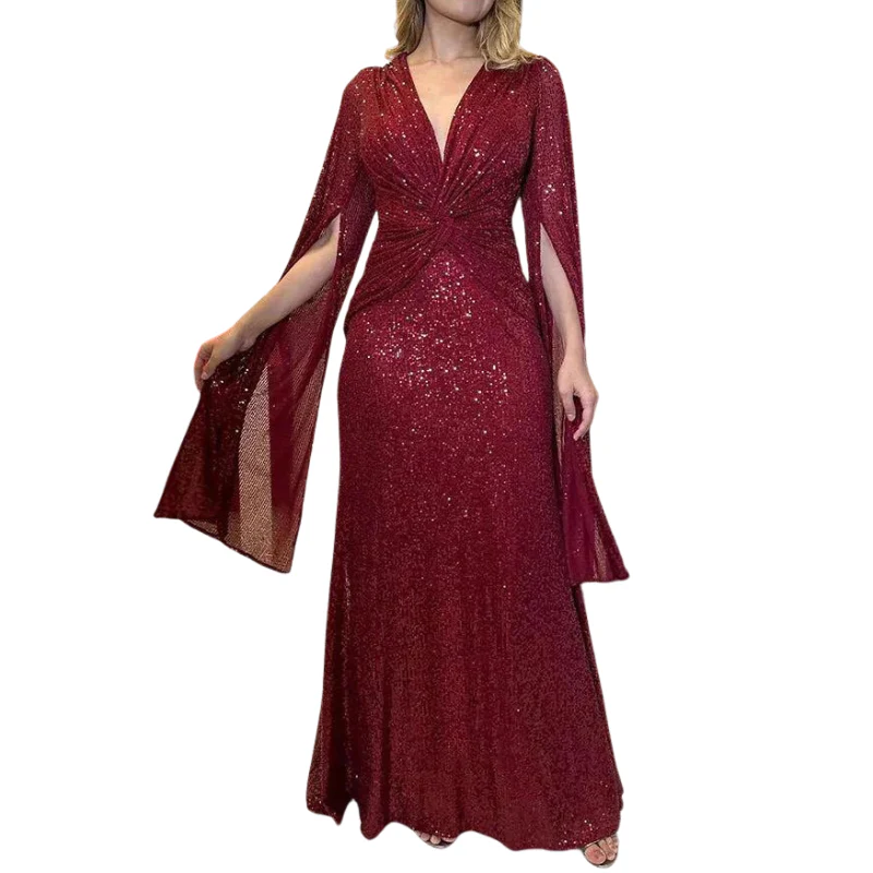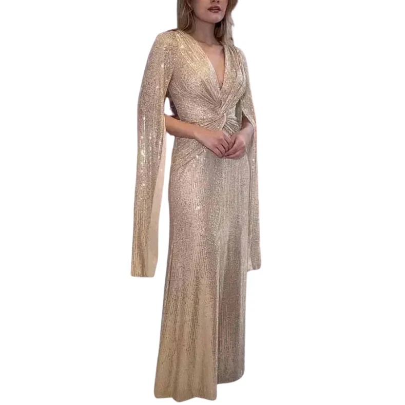 Optez pour le glamour total avec notre robe à paillettes à manches cape. Parfaite pour votre prochain événement VIP, cette robe est dotée de manches cape, d’une jupe longue vaporeuse et d’une encolure en V en forme de cœur qui cintre la taille et accentue vos courbes avec charme. Confectionnée dans un tissu à paillettes de qualité supérieure, cette robe époustouflante vous fera vous sentir glamour et magnifique lors de votre prochaine occasion spéciale.