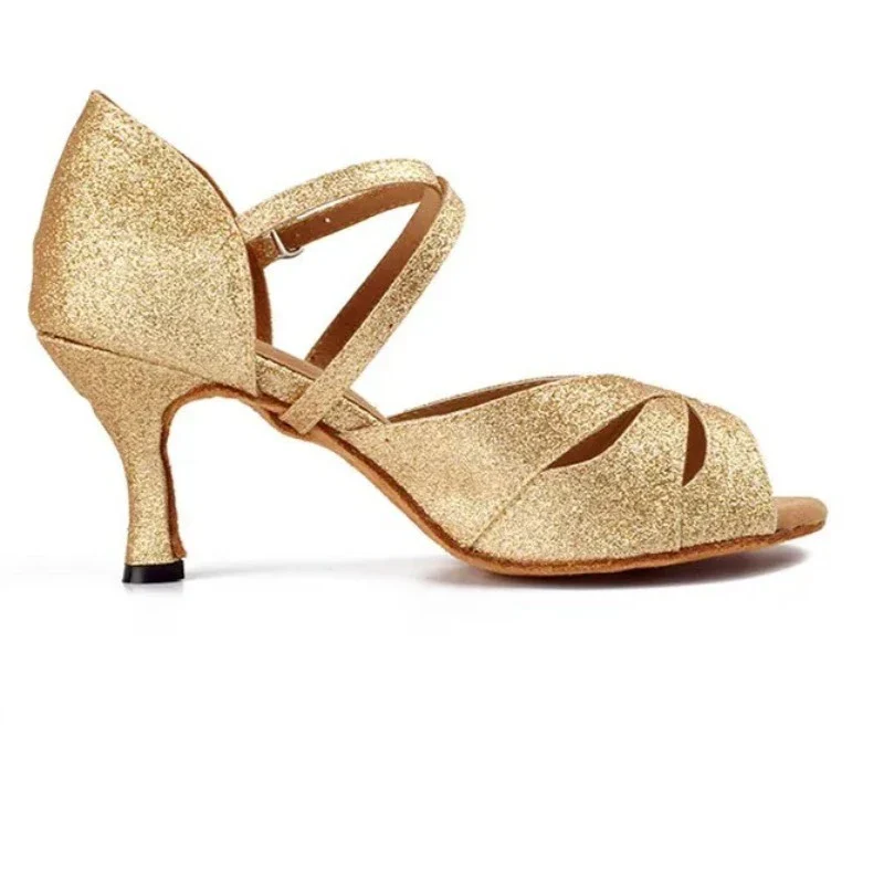 Belles sandales de danse à paillettes dorées avec une boucle rapide à attacher et des lanières croisées parfaites pour les cours de danse ou pour sortir. La matière brillante et le bout ouvert feront vite de ces chaussures votre paire préférée.