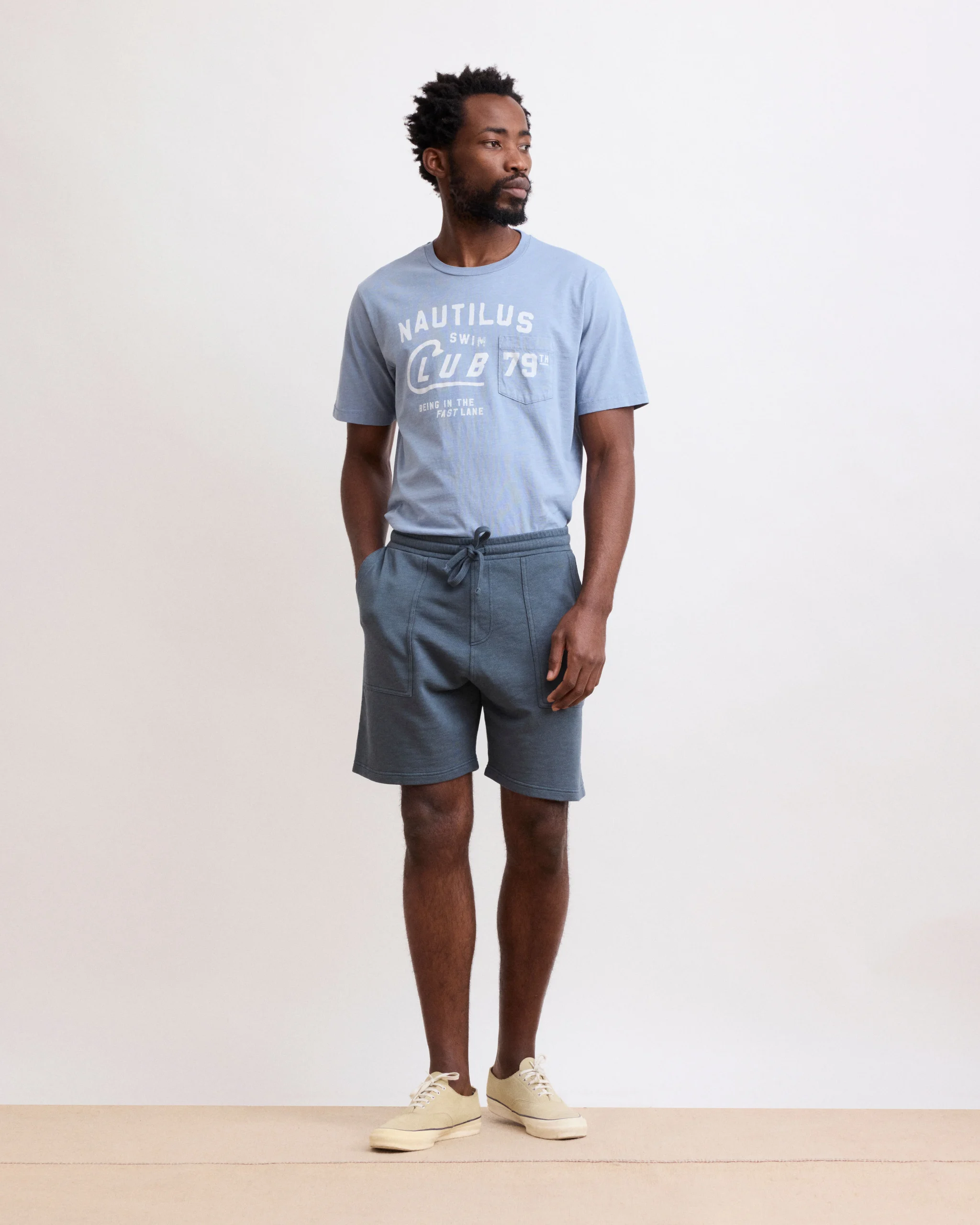 Short enfant garçon ample à taille élastique avec cordon de serrage, poches italiennes sur les côtés et poches passepoilées boutonnées à l’arrière.