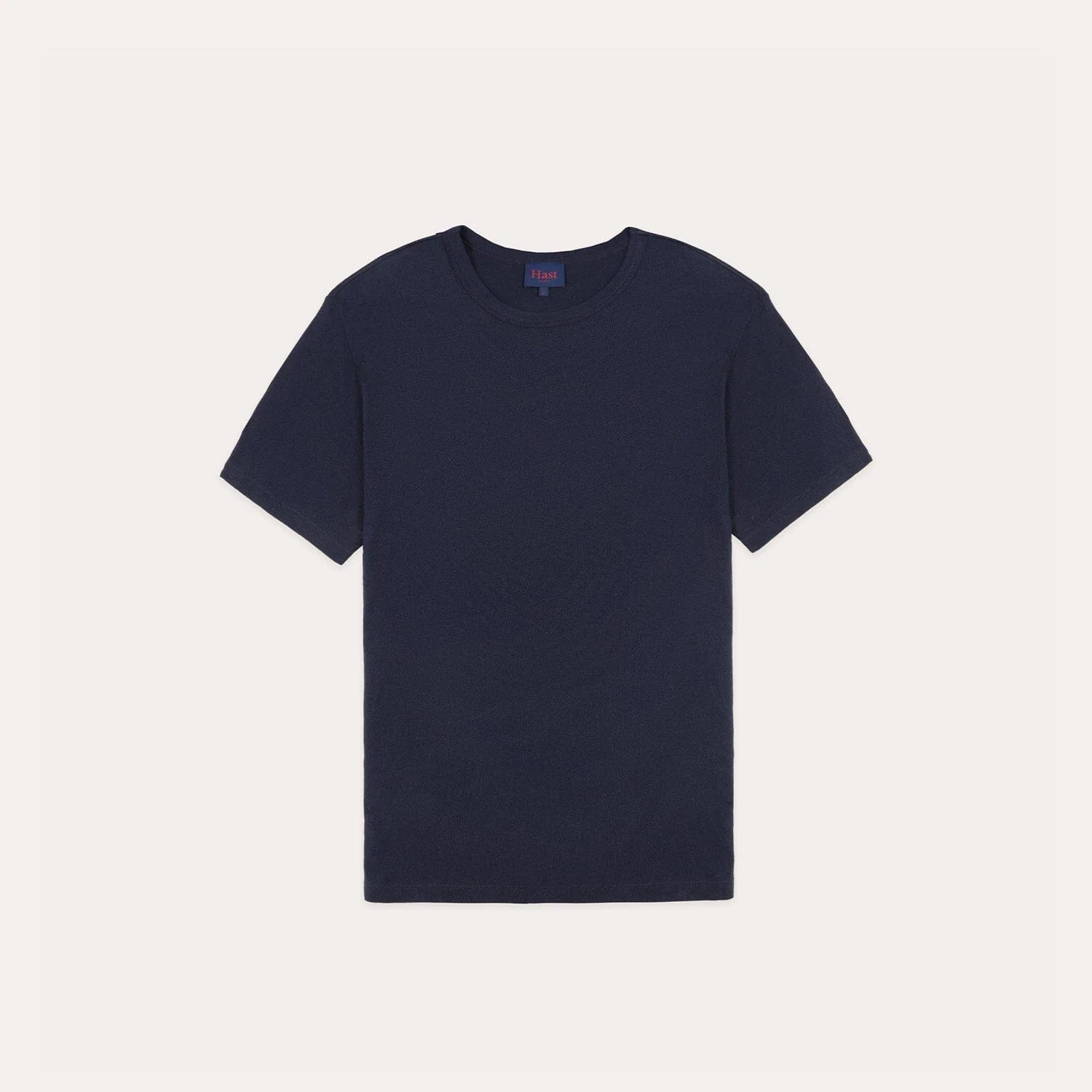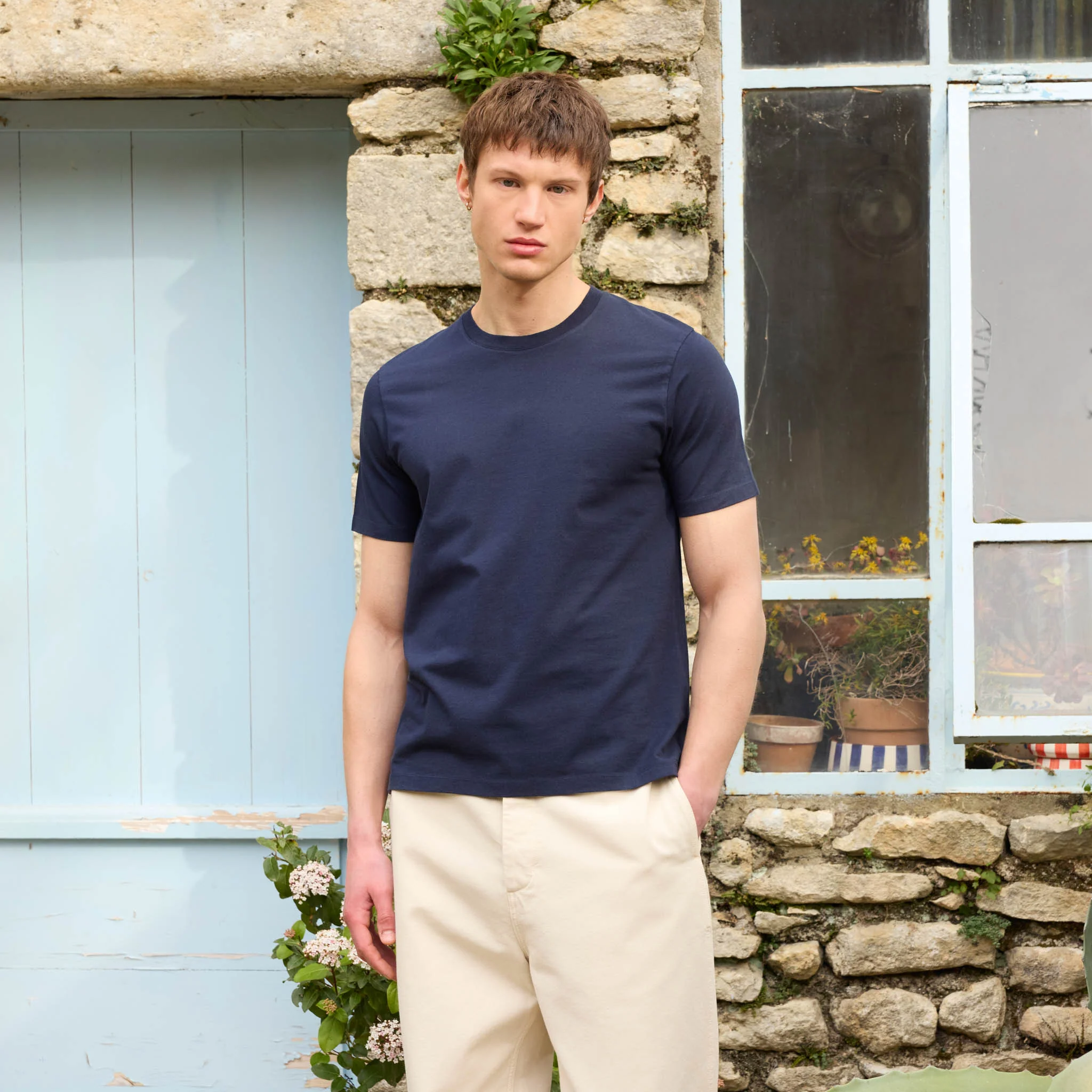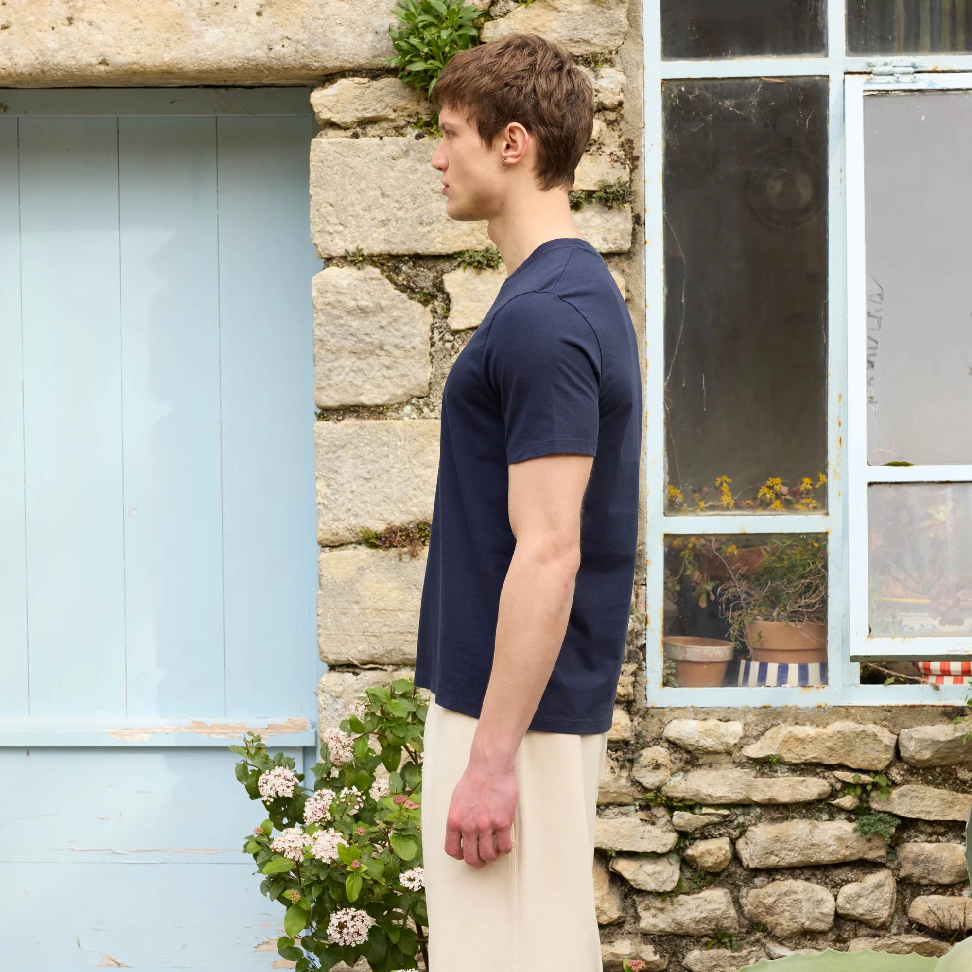 Un t-shirt marine en coton et lin, confectionné au Portugal. Avec un poids de 235g/m2, le tissu est dense, tout en laissant passer l’air. La matière finale est généreuse, souple, confortable et durable.