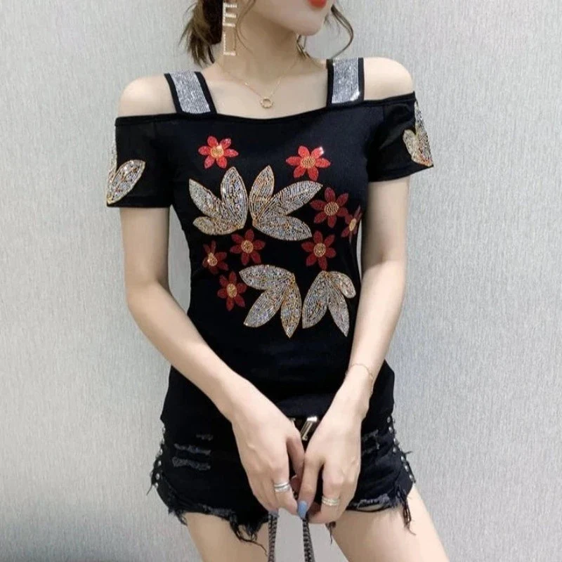 Notre beau t-shirt a strass pour femme avec une jolie encolure féminine en forme de bretelles. Ce haut est décoré d’un graphisme de fleurs en strass. Son design original et sa touche de brillance en font une pièce polyvalente pour toutes les occasions.