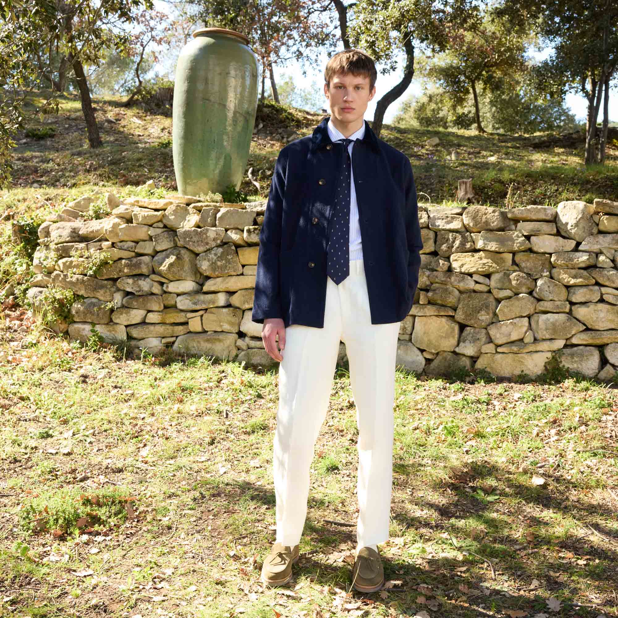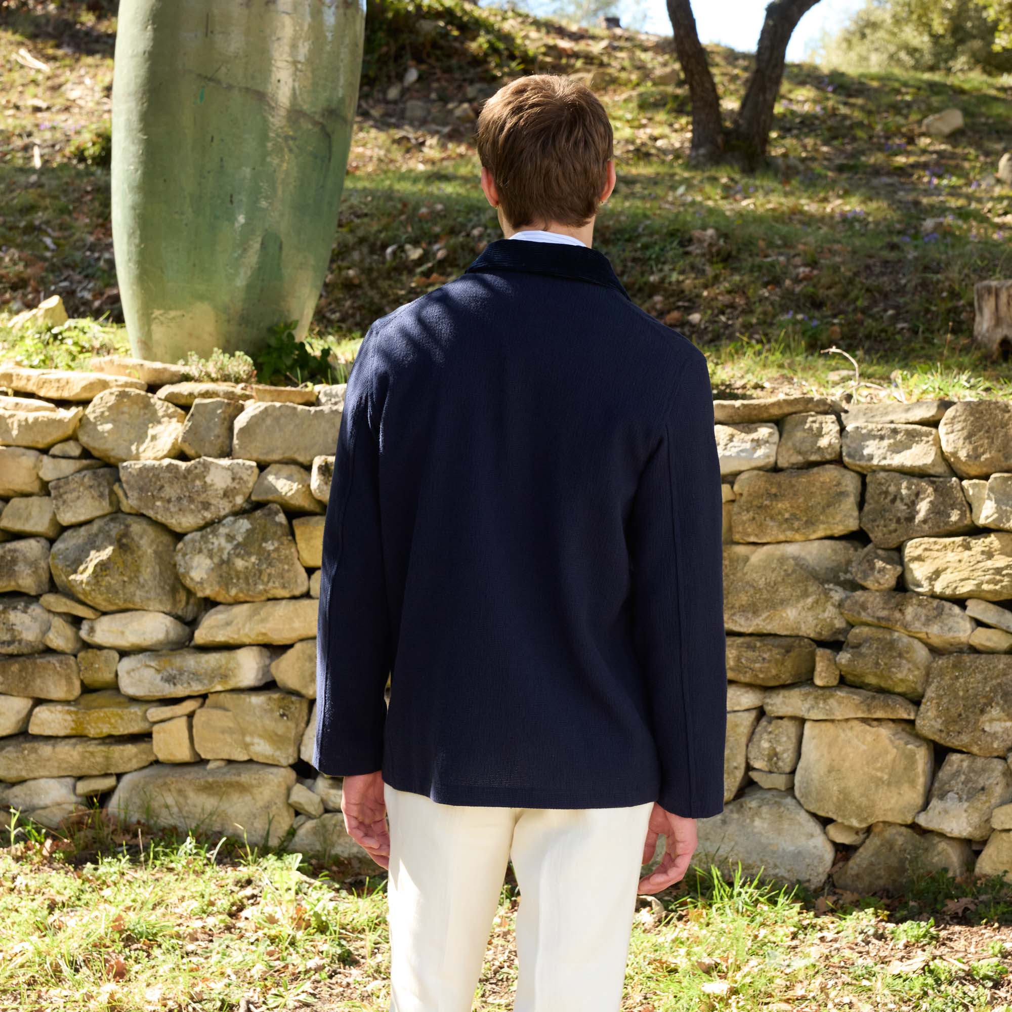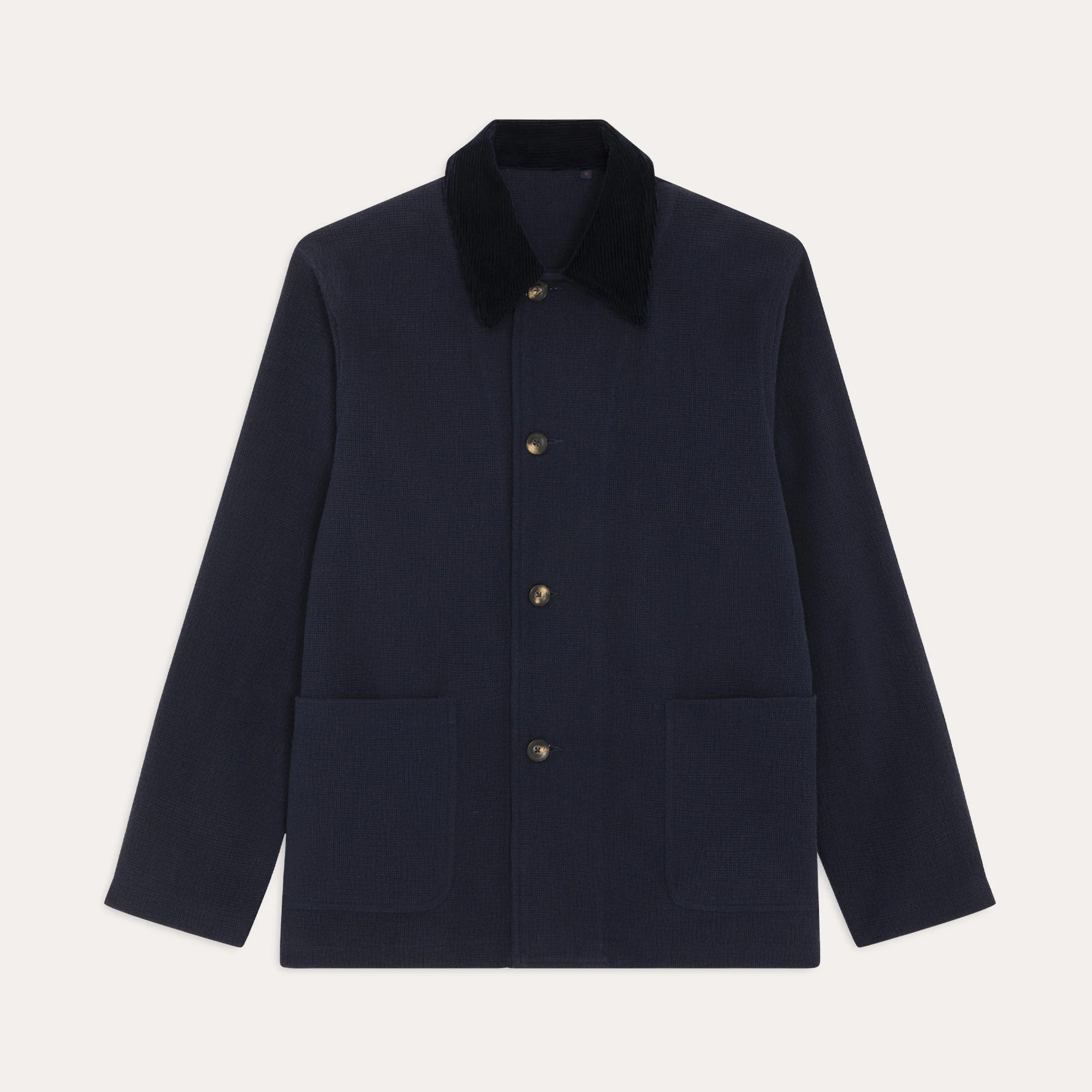 Cette veste de travail en 100% coton marine a beaucoup d’allure avec sa texture. Son col contrastant en velours apporte une touche d’élégance à cette pièce.