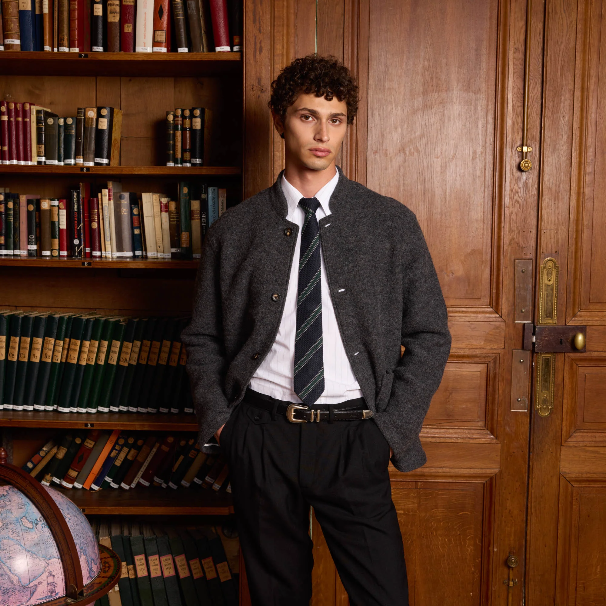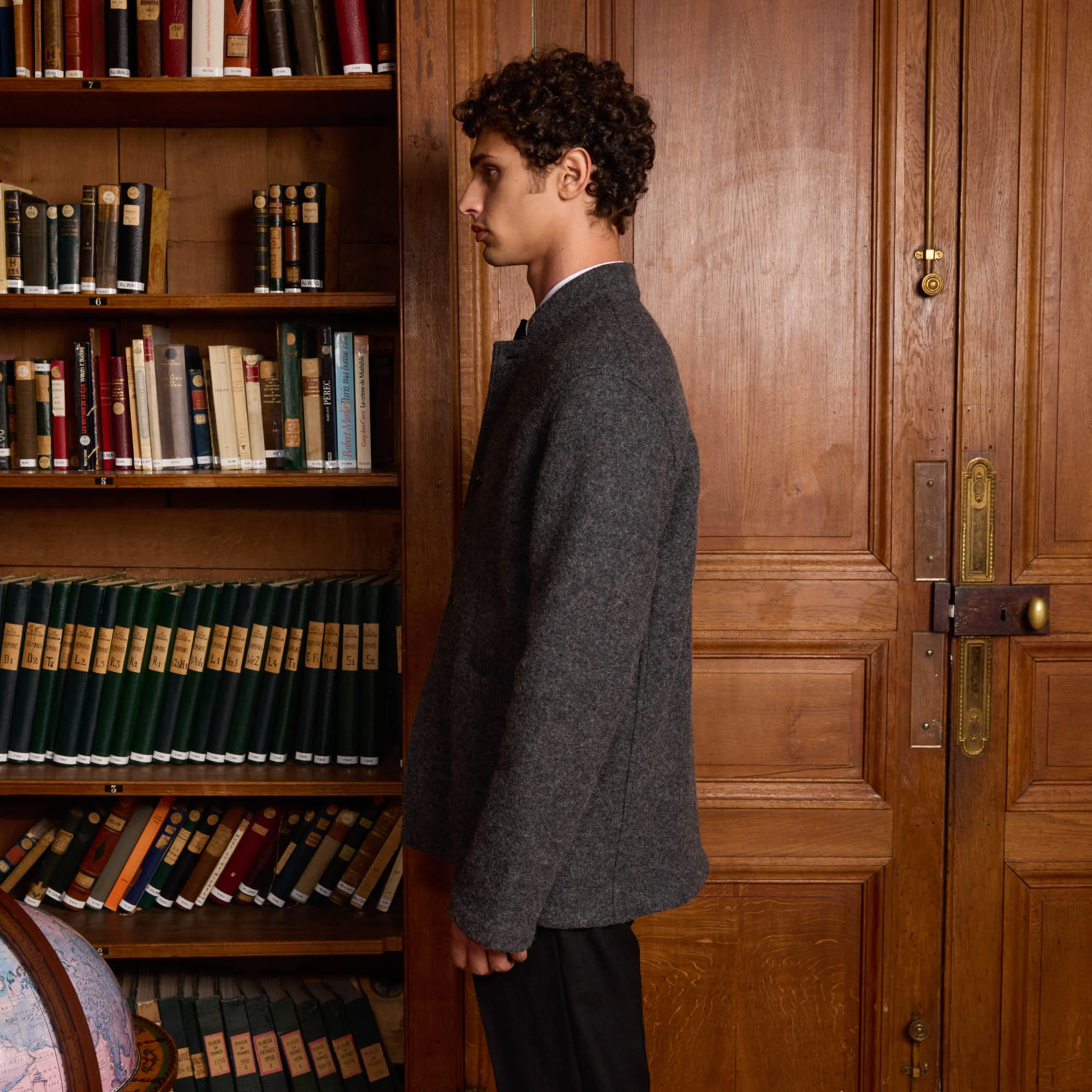 Conçue en laine bouillie italienne, cette veste de travail se distingue par un col sans rabats apportant une note contemporaine. La densité de la laine, résultant d’un traitement minutieux, garantit une excellente isolation thermique. Matière noble, la laine bouillie se caractérise par sa richesse, ses aspérités et sa texture prononcée.