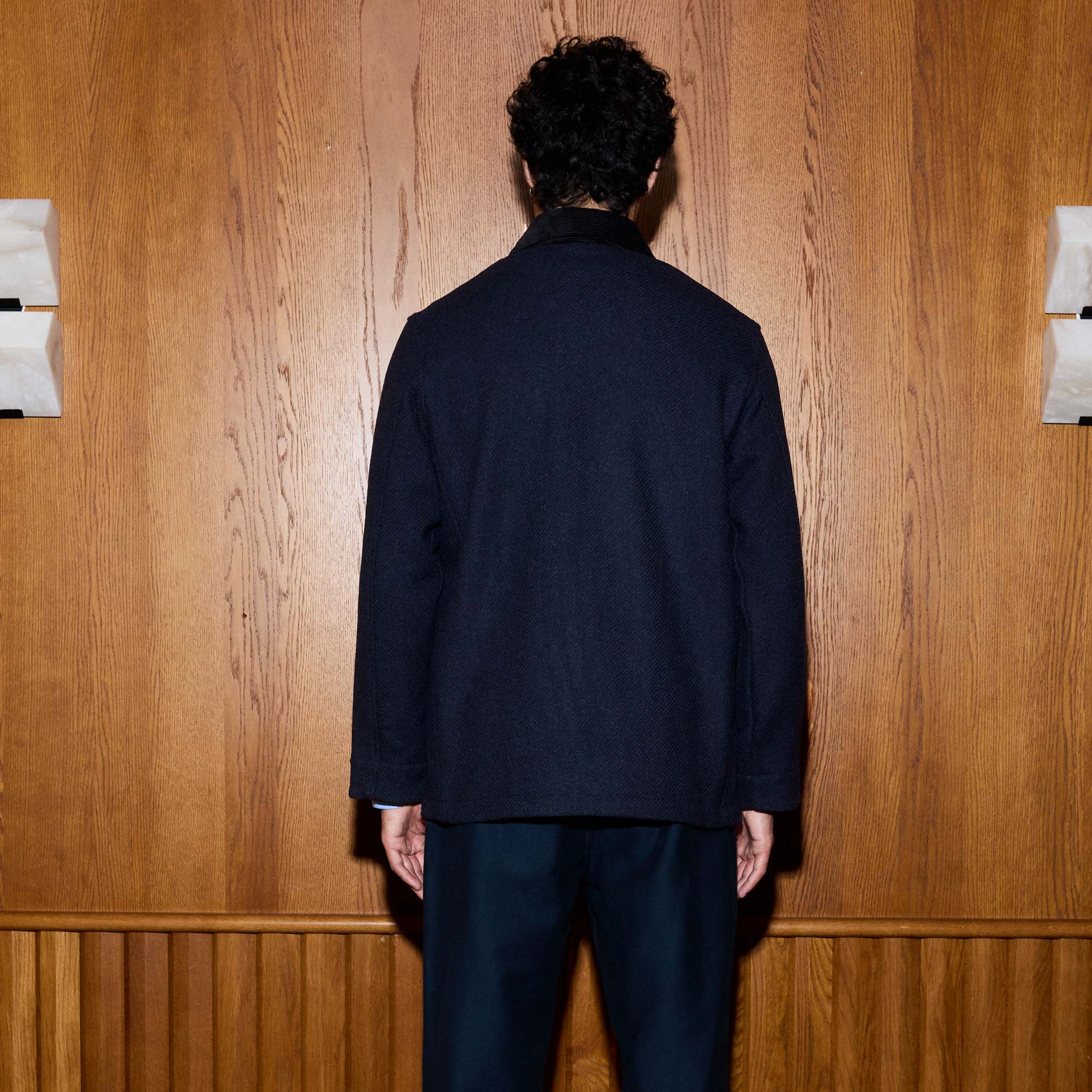 Cette veste de travail est revisitée dans un esprit légèrement rétro, avec une laine marine. Son col contrastant en velours dans un bleu profond apporte une touche d’élégance à cette pièce.