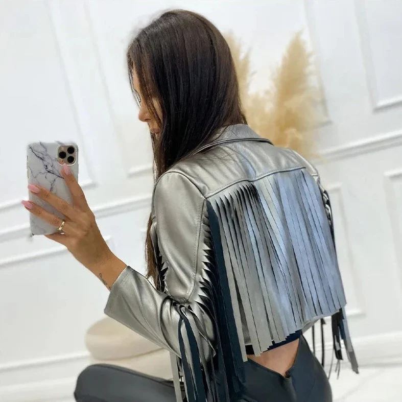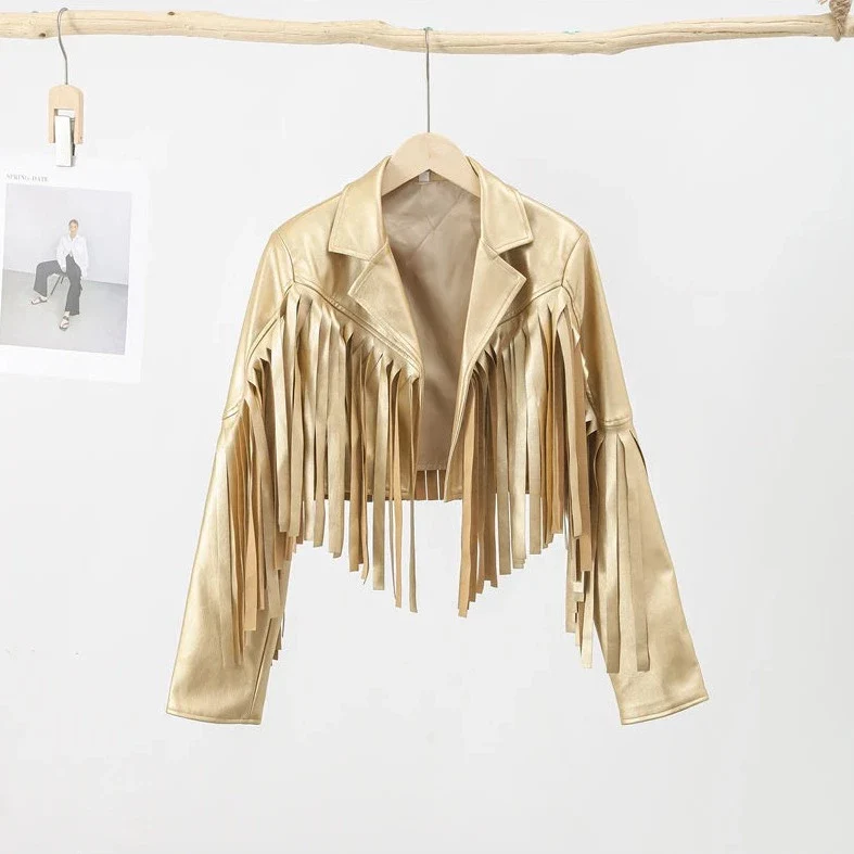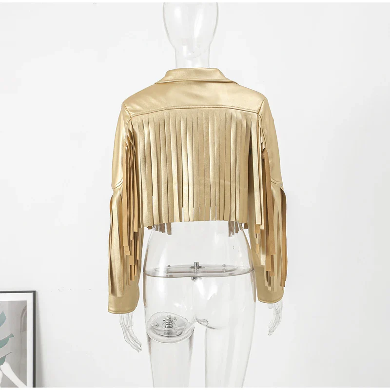 Optez pour un style tendance Bling Bling avec cette Veste Dorée à Franges qui ne passera pas inapercue. Idéal avec un jean slim pour compléter votre look. Vous aimerez son allure décoontractée et chic qui sera mettre en valeur votre féminité, et ses franges décoratives qui apportent un charme unique et remarquable. Parfaite pour briller à chacunes de vos sorties.
