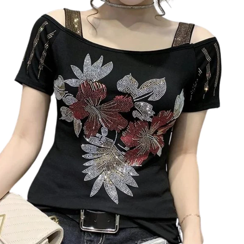 T-Shirt Paillette Elégant Manches Longues Col Transparent