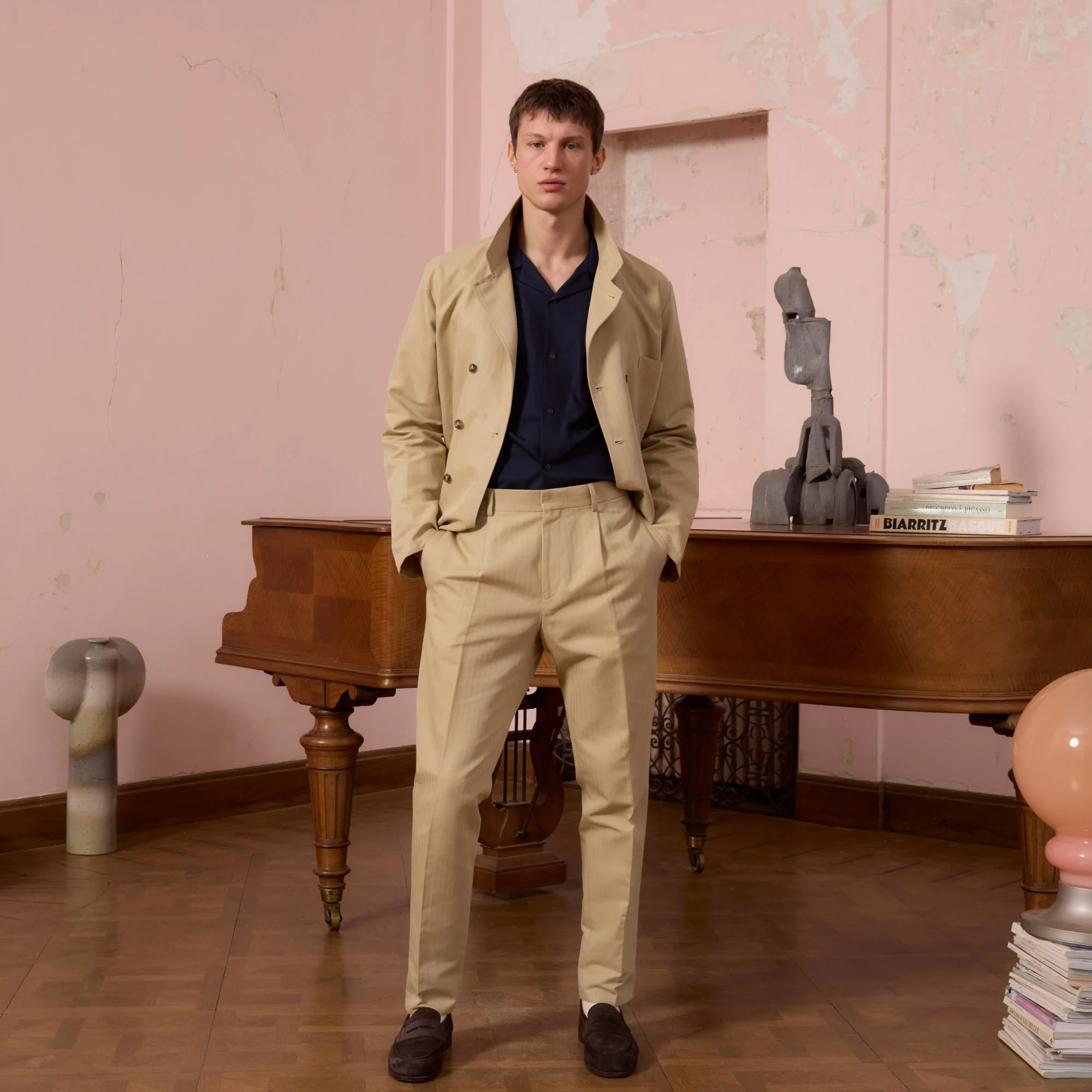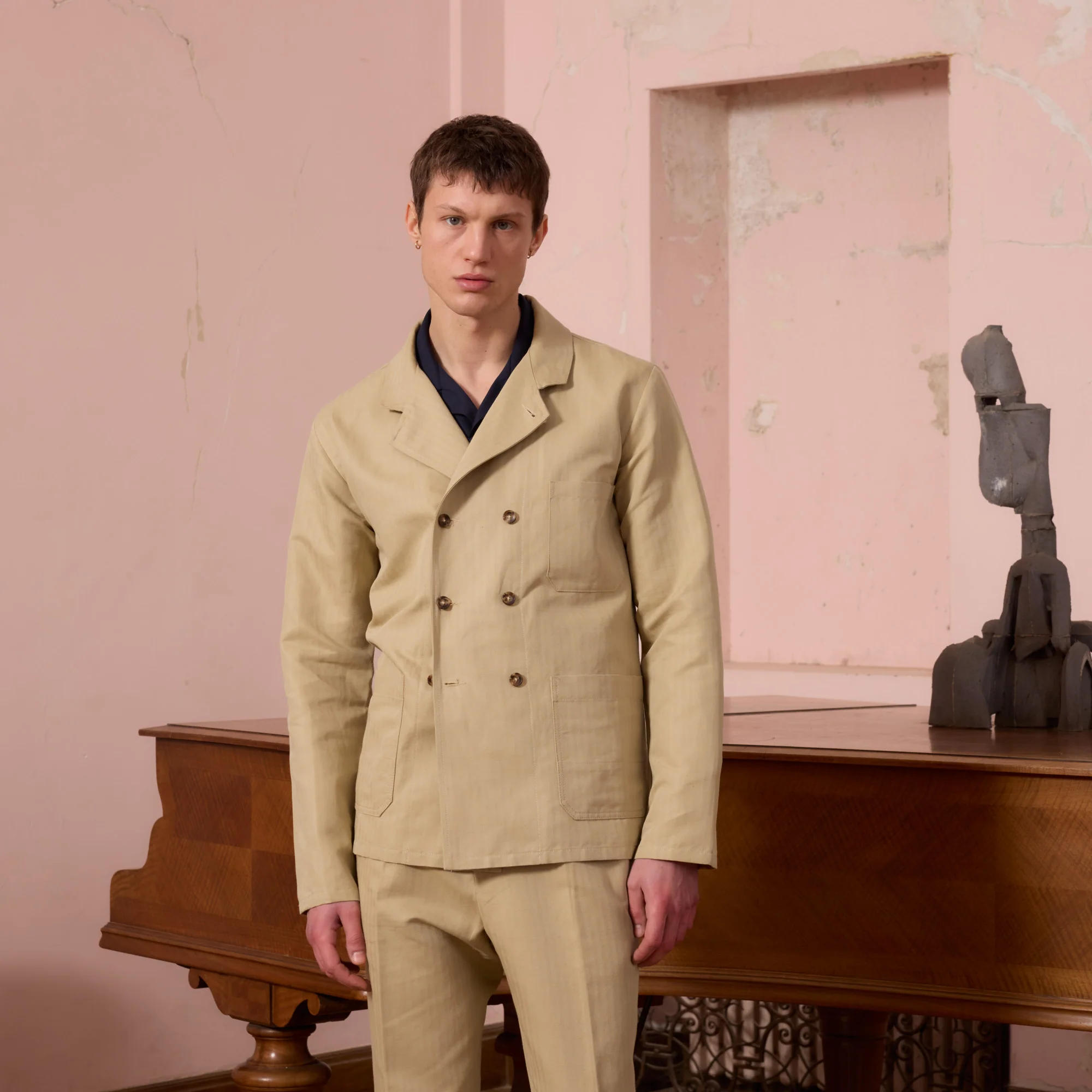 Veste de travail croisée en coton et lin beige