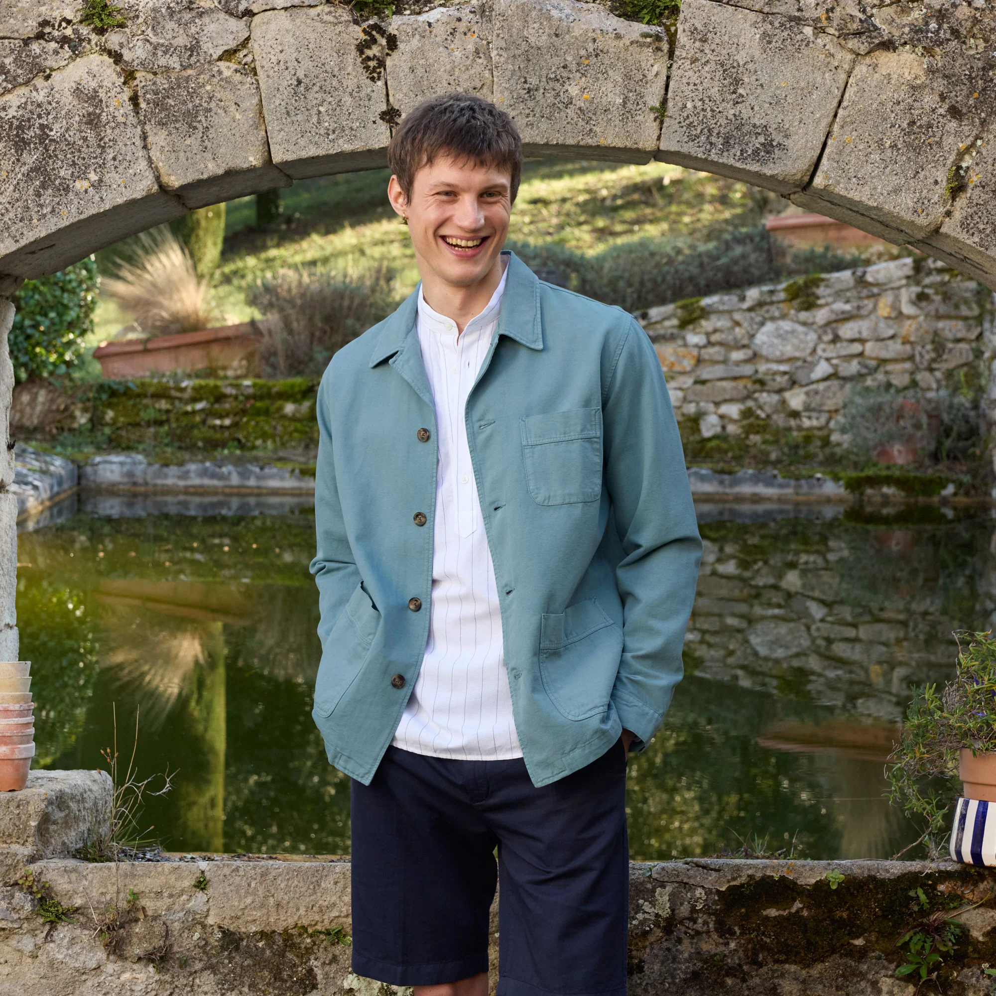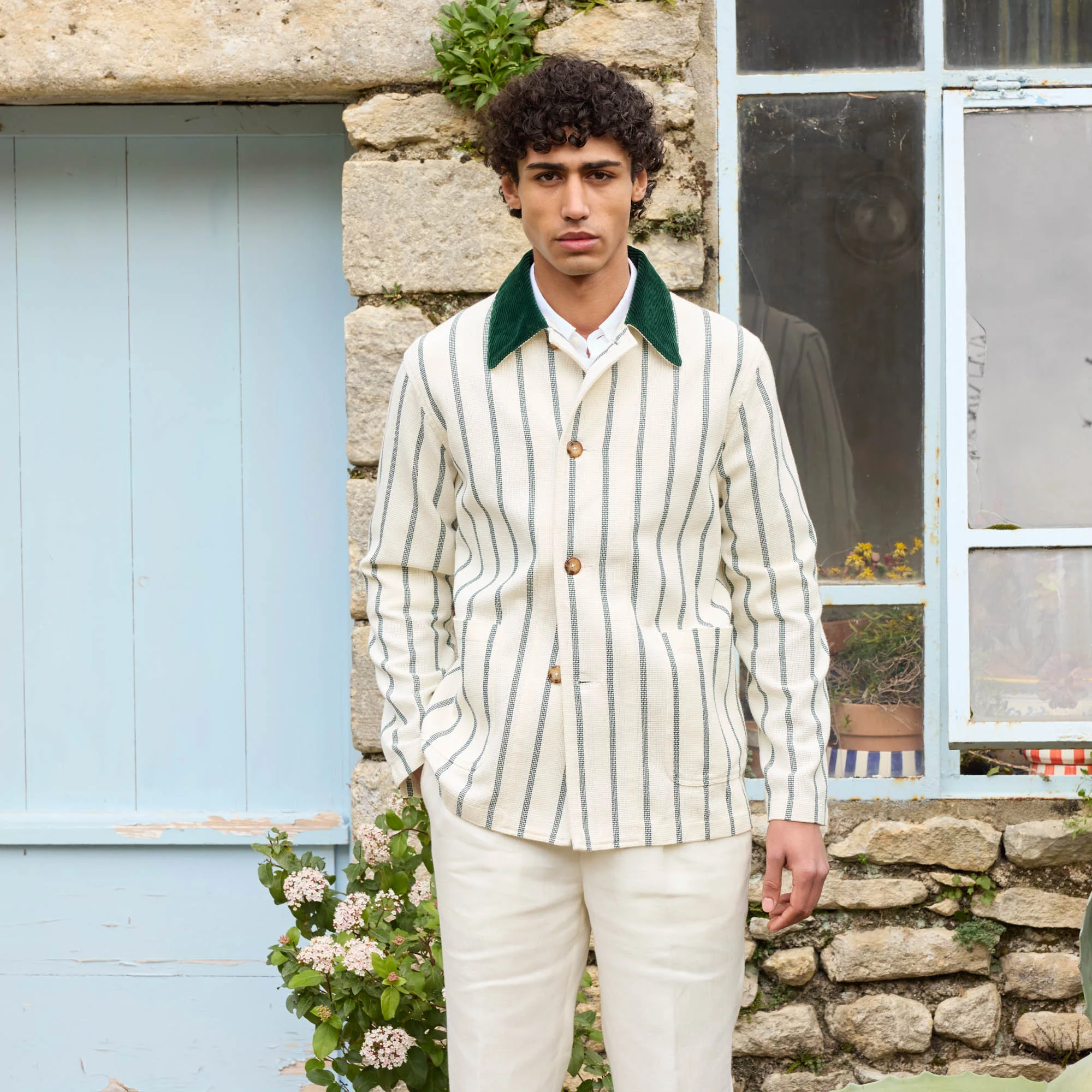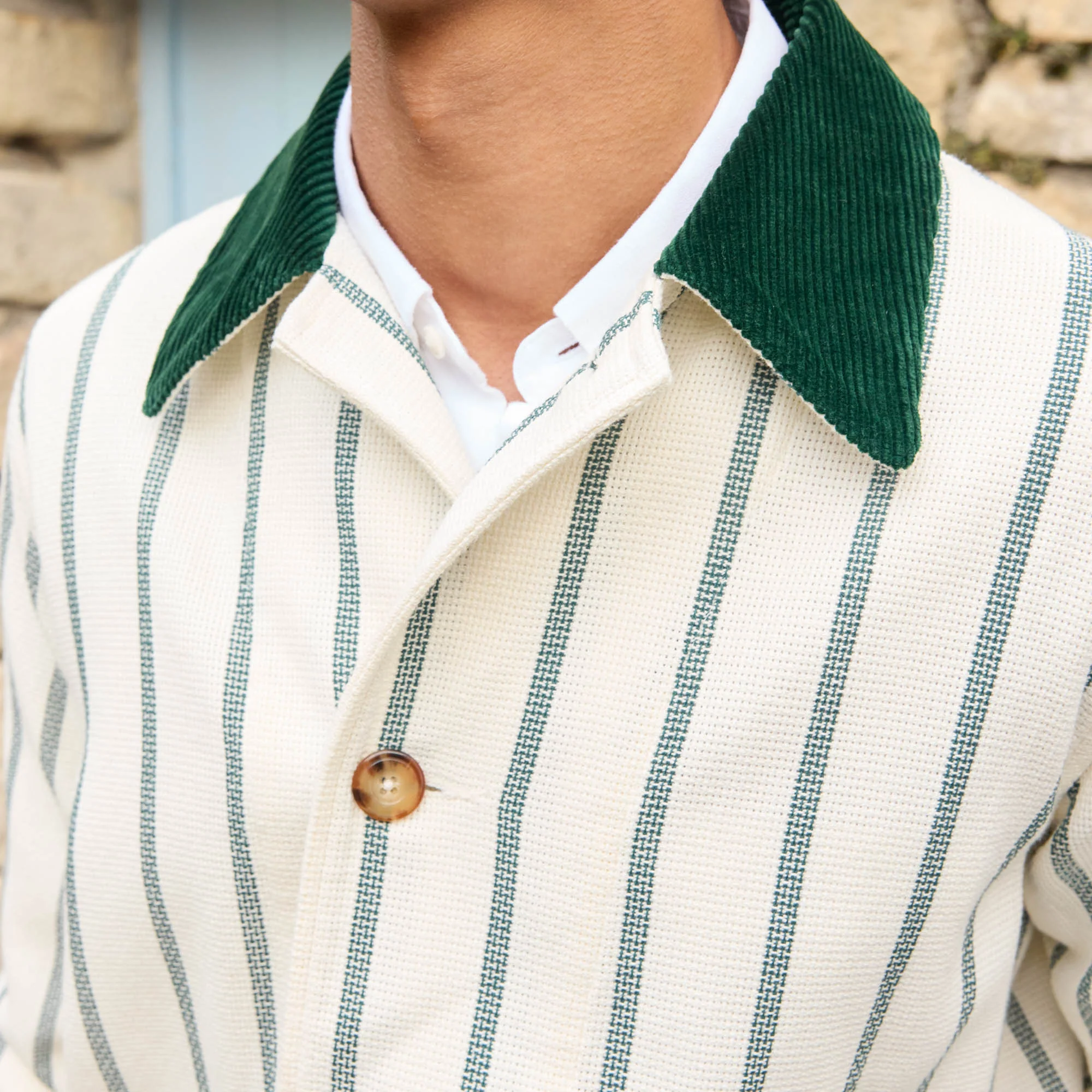 Veste de travail en coton écrue à rayures vertes